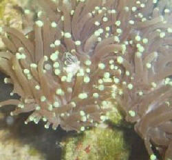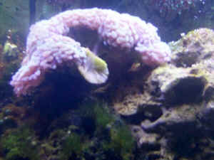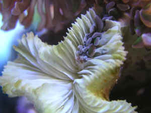 Bob Fenner> Branching Euphyllia glabrescens Hi Bob, I need your help with one of my corals. I have a 120 Gal reef tank. Amonia:0, nitrites: 0, nitrates: 0. Temp: 79F, Alk 4 meq/l and PH: 8.05. I have 2 Acroporas and some other SPS. I too have a E. ancora, and a E. divisa. All of these are doing quite well. 3 weeks ago, two tentacles of my torch did not fully expand, and have not since. Other polyps (In other branches) are doing OK, and expanding really huge. The polyps that don't expand look ok otherwise: they are not dissolving, and are not fully retracted either; but since this is the 3rd week they are this way, I looked much closely, and found that this two polyps are "bailing out" leaving the skeleton exposed. Some parts of the polyps are still attached, but I can already see the center of the corallites, and the digestive filaments from the underside of the polyps. They are not budding, since they are not growing another skeleton, outside the polyp, but the whole polyp is detaching. I fear that if I leave them this way they will end up going in the current and dying. Do you know what might be going on here?, and what can I do from preventing this from happening on the other 2 polyps?. This is a very nice coral and I feel very frustrated to lose it like this. Thanks a lot, Norberto. <Could be evidence of a reproductive mechanism... maybe there is some influence... too much of something, too little... involved... do you supplement iodine in some format? I would. Use zooplankton, other small foods? I would. Add a vitamin supplement to the water weekly, like Selcon? I would. Perhaps there is an infectious agent involved... but I would not "treat" the colony at this point (see the family Caryophylliidae scant coverage and FAQs on the www.WetWebMedia.com site... I will get to placing my version of the current "coral books" there in a few months. Bob Fenner> Anchor Coral Problem Dear Mr. Fenner I have a question regarding an anchor coral I recently purchased. I bought it about a week ago and now it appears to be dissolving. I have tested my water parameters and they're all perfect (PH, Ammonia, Nitrite, Nitrate, and Calcium). When I first bought it I put it near the top of the tank because I was told this coral needed strong lighting. I have 4 55w power compacts 2 are 10k whites and 2 are actinic blues. I was also told this coral didn't like strong current. So I put it between two rocks and not directly in the way of any power heads. Since the purchase I have been feeding my tank Kent Marines Phytoplex and Coral Accel about 2ml of each every day. The coral seems to be dissolving at the ends and working their way in towards the middle, even though the middle looks pretty healthy. My system is only about a 2 months old but has been cycled for about a month now. I have a green star polyp that is doing incredibly well. Any insight you might have would be greatly appreciated and thank you in advance for your guidance and wisdom. Thang Nguyen <Perhaps too much light, too soon... and this animal's genus (Euphyllia) do appreciate considerable water movement... and perhaps a negative biochemical reaction with your established polyps... but much more likely what you're seeing/evidencing is the repercussions of "collecting, shipping shock"... and perhaps secondary microbial involvement. Please read over the family Caryophylliidae section on the site: www.wetwebmedia.com and do consider applying the malachite green dip remedy detailed there... this may be the only thing to arrest the dissolving at this point. Bob Fenner> Anchor Coral Regeneration Bob, I recently used your malachite dipping method to stop a bacterial infection in my anchor coral. I believe that the infection has been stopped because the coral is no longer receding. Will this guy re-grow the tentacles that were lost while the infection was going on? <Yes... likely so. In time> If so, is there anything I can do to help the process or do I have to just let Mother Nature take its course? <A bit of both. Keep your system optimized and stable... an eye on alkalinity, biomineral content, use iodide and vitamin prep.s about once a week...> Thanks for your help and the cure! Chad <You're welcome my friend. Congratulations on your success. Bob Fenner> Please reply ASAP if you can please (Sick Euphyllia, spacebar finger) Bob After a fresh water dip my Anchor coral still looks like it rotting. All of my water parameters are excellent as with all of my other corals. I also added iodide and Selcon per reading the info on your site. Is this coral a lost cause?? <No, not necessarily... did you try the 1/2 malachite dip as suggested on our site?> Please advise ,I really don't know what else to do. Is this parasite going to finish off my coral? I have tried turbulent current, and slow current. Out of what was a large size Anchor from FFExpress there is only about 3 inches left with tissue on it. Thanks <You might be better off fragging what's left of the live portion. Do you have Eric Borneman's Aquarium Corals book? You would do well to enrich your background here. Bob Fenner> Air pockets in coral Hi Bob, I have a cup coral and a