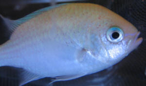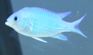 Green Chromis... beh. dis? Sys? No useful data 7/31/06 Dear WetWebMedia Crew; <Brendan> I added 4 green Chromis to my tank several days ago (4) and they were doing just fine until this morning. One of them has stopped schooling with the others and is staying under a rocky overhang out of the light, which from what I understand is a possible sign of illness. <Of some sort, yes> He also has hugely swollen lips with his mouth wide open, and only swims in place at approximately a 45 degree angle. <Not good> He has no other signs of illness, no spots that I could see or messed up scales or cuts of any kind. He was just fine in the store and was fine until this morning. So I was wondering: what is the matter with him, is it contagious, and what should I do? Your advice would be dearly appreciated. Brendan <... Please read here: http://wetwebmedia.com/chromis.htm and the linked files above. Bob Fenner> Blue Damsel - Danger? 5/12/06 Dear WWM Crew - Hello from Central Florida.... <Hello from rainy Chicago> We have searched for an answer to our dilemma on all sites we could find with FAQ's on Blue Damsels to no avail.... So, our query is this -- our Blue Damsel has suddenly sprouted a 'growth', for lack of a better description, on his back. It looks like a whitehead pimple. Is this dangerous? He eats and swims quite normally....hmmm....can you help? <Hard to say without a picture, but I would guess Lymphocystis, Google this and see if it fits.> Mark and Tom of Lakeland, FL. <Chris> Stocking question/ sick fish (Chromis) 4/14/06 Hello WWM crew, before I begin let me say that the service you provide for us hobbyists is greatly appreciated, you do a great job so please keep up the good work. <Am trying...> Currently I have a 100 gallon long aquarium with built in skimmer box, a 20 gallon refugium harvesting Chaetomorpha, and a 30 gallon sump containing a Euroreef skimmer CS135. I have roughly 150lbs of live rock, and maybe 80lbs of aragonite sand. In terms of lighting I have 2 13K 250 watt PFO halide pendants, 260 watts of compact fluorescent supplemental lighting, and 2 moonlights. System has been running for 14 months and water quality is good (salinity <1.024>,ammonium 0, nitrite 0, nitrate <undetectable>, phosphate <undetectable>, alkalinity <2.9meq/l>, calcium<350ppm>, temp is kept between 76-78 degrees Fahrenheit. I use Aquarium Pharmaceuticals Test Kits for everything. My fishy friends include a 4" hippo tang, 3" Kole tang, 2 false perculas, a sixline wrasse, and 3 Chromis damselfish. In terms of invertebrates I have a 5" Tridacnid clam, a Brittlestar, a gorgeous BTA ( I know...bad....but I'm determined and resourceful), and frogspawn and hammerhead corals which grow and split continuously. I change 15 gallons of water weekly, and feed a mix of Mysis, krill, blood worms, and Spirulina. I have a couple of questions and will enumerate them for simplicity. <Good, and sounds good... except for the mis-mix of cnidarians thus far> 1.) In terms of stocking, Have I overdone it? <Just not done it right... I would likely remove either the Scleractinians or the BTA> Right now I don't notice any aggressive behavior among the fish. I was interested in adding a flame angel, would this be a bad move? <Should be okay here with the mix, crowding> 2.) One of my Chromis is refusing food and seems to either hang around the filter box or end of the tank. I don't see any signs of external parasites or disease and the other fish don't seem to be harassing it. I have owned him for almost a year now and am quite attached. I was planning on just moving it to my 10gal QT tank and hoping for the best. Is this okay, is there any kind of medication I should attempt? <I would not medicate this animal, nor likely move it. Try "other" foods. It may "just" be "old"... Bob Fenner>> Darkening Chromis 12/21/05 Hi Crew, I recently purchased thirteen green Chromis to start off the system in my 330 gallon tank. They all looked great except for one who was missing his upper lip and an 1/8 of his right pectoral fin. <... such "cut" damsels should be avoided... all in a batch> This didn't seem to be a problem as he was active and feeding well. Today I noticed that he is almost completely tinted a smoky black color (he looks like he is dirty). His eyes are also brown or black, even in the iris. <Good descriptions> I am feeding the school an enriched flake food that helps prevent color loss and he has been eating just fine. One of the others also appears to be beginning to be darkly tinted and I don't want it to spread. Is it anything I need to be concerned about? <Oh yes... whatever predisposing factor/s are at play (likely rough handling, starvation... possibly cyanide or other toxic capture technique...) may spell the end for this group of Chromis... Only time can/will tell. You can read more re Damsel, Chromis Selection, archived in the FAQs on WWM. Bob Fenner> Help - Losing Chromis 12/9/05 Hi there, <Hi Matt!> Got some Chromis, had them for about 2 months, I then noticed that the stomach of one was indented.. very thin. <Starvation for one reason or another...> <<Chromis are often (not always) collected with cyanide. Cyanide destroys the gut lining of fishes, disallowing ab/adsorption of nutrients. This effect can take many, many months to present. Thus, the fish eats, but starves to death, much like King Midas. A read through the Industry Forum of reefs.org will net much information, with contributions from many experts in the field. Marina>> Two days later I found him in the sump. He was the biggest of 5 in a 105 Gallon system. <Just too weak to avoid the overflow.> Last night another of the Chromis was swimming poorly. Today I found him in the overflow.. barely alive due to stress. He has now died. <Sad. Might be time to re-evaluate your foods and feeding routine.> I believe I have a Mantis shrimp in my tank due to a clicking and there are a heap of shells and bits of rock that are being removed from my rocks. <Sure sounds like i