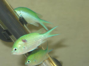Green Chromis Losing Scales 9/24/08 Hi there! First of all, whoever came up with this website was brilliant! <Mmm, well, a few of us here do like Guinness...> I have searched far and wide on the Internet and have never found a sight as informative as this one. ( And you're going, "Yeah, yeah. If I only got a dime every time someone coined that phrase." :) <Or a nickel after currency devaluation> First of all, I have a ten gallon saltwater quarantine tank. I bought four Chromis and a royal gramma <Mmmm> about three weeks ago. Water parameters are great, and everyone is happy an eating me out of house and home...well not really, but you get the picture. I feed them copepods, squid, Mysis shrimp, formula 1, Angel formula, and they absolutely LOVE the freshwater tropical fish flakes I feed them. (I have actually found that the saltwater and freshwater flakes have very similar ingredients)Recently, I noticed that three of them are losing scales. <Yes...> I was thinking that the loss of scales would be caused by pecking order disputes, but their hierarchy has already been established. Any ideas? <I do fully suspect this is inter- and perhaps with the Gramma jammed in there, intra-species aggression...> Though many say they are hardy, I have read that they are usually captured roughly. Do you think this may be the cause? <Doubtful. Most such damaged specimens don't "make it" this far> (Btw, the gramma looks great, not a scratch on her!) <Here's a clue> Thanks for your valuable opinion! Brielle <I would move your acclimation, introduction procedure forward and place all these fishes in your/their main display. Cheers, Bob Fenner> Sick Chromis? Data? Reading? 8/1/08 Hello there, WWM Crew! I've got a rather puzzling question for you guys (or maybe just Bob.) I can't find the answer elsewhere, so I'm turning to you guys for help! <Ok> Anyway, I've got an Orange Line Chromis. <A single individual? This species (Acanthochromis polyacanthus) is social... needs to be kept in a group> (I'm not sure of the scientific name. This is just the name that was on the tag on the tank when I bought him.) I've had him for over a year with no problems and he's always been in great health. Just the other day, though, I noticed he had a rather large (maybe swollen) abdomen. He also occasionally swims at an angle and it seems as if he's almost straining to stay swimming. He only does this for a few seconds though. It happens every so often, but it seems to be getting worse and happening more often. All my water parameters are perfect and he's in a 45-gallon tank. So, I don't think it's the size of the tank or water quality. Please help me save my poor Chromis. :( Thanks, WWM Crew. <Please read here: http://wetwebmedia.com/chromdisfaqs.htm and the linked files above. Bob Fenner>