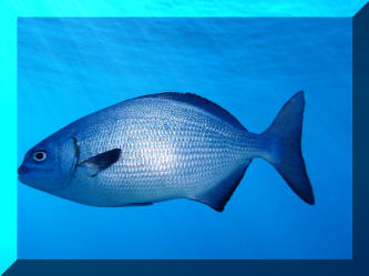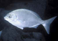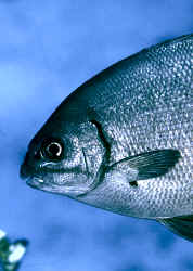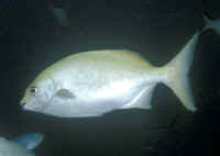 If I had a hand in re-naming the part of the sea chub family Kyphosidae ("key-fos-id-ee") called Rudderfishes (for their habit of following ships at sea) I'd volunteer the appellation "swimming footballs"; for their oval-shape, vigor, and fondness for feeding. Though they have small mouths equipped with equally small teeth, the subfamily Kyphosinae are eager eaters. Hardiness is this group of fishes singular strongpoint; like some of the cichlids and livebearers, there are naturally occurring "golden" morphs, notwithstanding most are silvery with darker highlights. Another strike against Rudderfishes is their size; most attain more than a foot. All species are best displayed in a small school, and this obviously requires a system of large proportions. Nevertheless, these fishes can be easily captured, ship and live well in captivity; and in the age of so many public aquariums and private folks with humungous tanks, Rudderfishes do have their place. Classification: Taxonomy, Relation With Other Groups Modern schemes include three or more subfamilies (ending in -inae) within the principal sea chub family Kyphosidae: The subfamily Girellinae are called nibblers for their habit of grazing. The cool water California opaleye, Girella nigricans, Baja's endemic gulf opaleye, G. simplicidens and the prettier Zebrafish G. zebra from the southern half of Australia occasionally make their way into hobby markets. The Scorpidinae, termed Halfmoons for the semi-lunate shape of their tail fins. Indo-Pacific to cool water California; rarely seen in the hobby. The Kyphosinae subfamily is the Rudderfishes proper; they are also called chubs or sea chubs (of course), and pilot fishes. Rudderfish species bodies are high in profile, and compressed side to side, bearing large, forked tails. They have small heads with equally small terminal mouths. If you look carefully, you will observe that their dorsal and anal fins are somewhat overlapped by a sheath of scales. Four genera, Hermosilla, Kyphosus, Neoscorpis and Sectator with eleven species. None of the subfamilies members are stock items in the trade. A few are exhibited regularly in public displays and a handful are offered from time to time. In the genus Kyphosus, K. elegans, the Cortez chub of Mexico's Baja and the sympatric Atlantic/Bermuda chub K. sectatrix, are available from time to time, as is K. cinerascens; mainly out of Hawaii. The first and third of these occur in golden/xanthic forms and sometimes "Koi" mixed color (silver, white, black, golden-yellow) naturally occurring varieties.