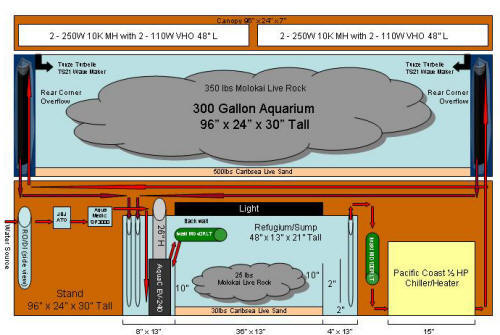 One pump or two? 5/15/06 Hi Crew < Hello Adlai! > I am trying to plumb my new 120 gallon and wanted some advice before going down this path. Taking your advice I swore that my next tank would be reef ready - no more dinking saltwater for me via J tubes. < I cant say I blame you a bit! > The tank has 2 overflows rated at 600 gph each so I expect 1200 gph approx into my sump. In ADDITION to sending water through the 2 returns which come with tank setup I also plan to draw water from the sump via a SCWD using a ViaAqua 2600 rated at 740 gph. This means I will have 4 returns (2 with the overflows and 2 with the SCWD) using the sump water. So I figured I needed approx a 1200 gph submersible to make allowances for head loss pressure etc. Since the drains are only rated at 1200 gph that is the maximum amount of water that will be coming in to the sump which is 12X24X14. The 2 returns can be powered by either 1 pump (any recommendations) or 2 separate pumps ( I have an Eheim 1260 and a ViaAqua 2600). In addition, another ViaAqua 2600 which is also in my sump, will be shooting water through a SCWD and 2 separate returns. In regards to the SCWD return, my thinking is that since the ViaAqua is rated at 740 gph, I expect about 50% of water flow because of the SCWD and the returns i.e. approx 370-400 gph of flow. < You are correct, the SCWD reduce the gph significantly. You may want to employ a larger pump to enjoy the benefits of the SCWD. 400-500 gph will be almost unnoticeable. Think about running the SCWD on a closed loop, with a pump rated for 1000-1200 gph. This can be done without drilling any more holes in the tank. When plumbing the SCWD, consider installing true union ball valves. This will allow you to shut off the water completely, and service the SCWD without losing too much water. Some people will have a secondary SCWD to switch out, while cleaning the first. > In regards to the regular returns , the Eheim I currently have is rated at 635 gph will give me about 50% water flow at a 5 foot head approx 320-400 gph. The other ViaAqua 2600 will give me about 350 gph at 5 ft head So when I add all 3 pumps in the sump I will be getting approx the 1200 gph which the returns are rated at. Are there any flaws to this logic? < Three pumps in the sump may generate too much heat! > Am I not considering any potential challenges. Should I just use 1 submersible pump to send water back the 2 tank returns so that I will only have 2 pumps in the sump. < Think about running one pump for the return, rated at or near 800- 1000 gph. With the build-up of detritus and biological waste over time, the maximum water handling of the overflows will be reduced. It is better to be slightly underpowered in that regard. Also, if contact time is crucial in the effectiveness of the filtration methods employed in the sump, slower is better. Think of it this way... Let's say your job is to steal hubcaps. Would you be more successful on the freeway, or in a parking lot? > I hope this makes sense. < Makes sense to me! It is good to see planning and consideration! > Thanks in advance < You are very welcome. RichardB > Set-Up 2/Pumps/Circulation - 05/05/2006 Hey everyone, <Hello Marc> I am looking to get an Iwaki pump to power a closed loop circulation system for my reef tank. I am looking at either the MD70 or MD40 pump for the job. The tank is 120 gallons and I have set the system up to return to the pump in the cabinet and back up to a manifold with four outlets ¾ inch each (I could plumb more in) approx 5 feet above the pump. My question is that there are two types of pumps that seem to be sold, a pressure pump and a circulation pump. What is the difference and is it as simple as picking the circulation model for this task or should I consider the pressure model for other benefits? <The circulation pump will be just fine. The pressure models are used for protein skimmers and pressure filters where the water has to have some pressure behind it to operate these systems properly.> I am considering dropping some outlets down at the back and forcing water through various low flow areas to get the most complete flow. In doing this I assume it would generate more friction (increased pipe work) therefore more head and a higher pressure requirement? <Not enough where you would need a pressure pump.> Thanks for your time <You're welcome. James (Salty Dog)> Marc Pump selections 9/6/06 Dear Mr. Fenner: <T Ruby> I am moving up in the reefing world and got a 75RR tank and will be using my old 20g long as a sump. I am a little confused on what pumps to use. I am hoping you can shed some light for me. I bought the MRC MR1 skimmer and the GenX PCX40 for the skimmer pump. I do not know what type of pump to consider for using as my return pump. My overflow is rated at 600gph and has 1" inlet and 1" drain <An important consideration... won't be able to handle this actual flow rate... Might consider re-drilling or having another through-put drilled... of larger diameter> and both are plumbed using 1" spa flex hose to the bulk heads in the bottom of the tank. You have any good suggestions on a return pump? <Yes... Read here: http://www.wetwebmedia.com/pumpselmar.htm and the linked files above> I was told to consider the Pan World pumps. Along with this, I would be in need of a 3rd external pump, I am planning on plumbing a closed loop for this system, I really hate the ugliness of powerheads in the tank. I will be using 1.25" PVC going up to a "T" then 1.25" going left and right off the "T" to 90 degree elbows. Then right at the elbows reduced down to 3/4" PVC running up to the top of the tank to a 90, then another 90 going down into the tank. This will be the same for the left side and right sides of the tank.. What type of pump would be able to push about 800-900gph at that head pressure?? <See the above...> If I do not do the closed loop, what do you think about the wave2k? <A worthwhile unit> would this replace a closed loop system? <Mmm, 