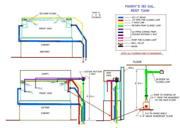 Many Manifold Questions... Dear Crew, <Scott F. your Crew member today> Reading through your plumbing articles and FAQs has inspired me to redo my reef plumbing. I especially love the closed loop manifold and am thinking I need to mosey on down to the local hardware store to start picking up some PVC. <Great idea, fun to plan and build, and really useful!> I have a couple of questions before I mosey, though. <Sure..> I have an in-sump Mag 9.5 whose return line is upgraded to a 1" flex hose. The return line travels five feet to the top of the tank and will connect to a 3/4" pvc closed loop manifold. Question one: Wouldn't 8-45 degree angles in each corner rather than four 90 degree angles help to prevent the water return pressure from reducing in the manifold? <Good question, and I suppose the answer really depends on the outlets' distance from the pump. On the other hand, you want a fairly sizeable number of outlets for maximum water dispersion/circulation, so it may be better to go with the greater number of outlets at lower pressure...You may have to experiment a bit before the manifold is installed...> Question two: I plan on having six outlet Tee's, one in each corner between the 45 degree angles, one in the center of each long side. The tank is 36"LX18"X18". What I haven't been able to determine searching through the plumbing/manifold FAQs is what size should the flexi ball socket tubing for the outlets be, 3/4" or 1/2". I'd like to get the best flow possible coming out of the outlets-not too weak, not too restricted. <Agreed...If it were me, I'd go for the 3/4"> Thanks again for all the help you folks have given me and fellow aquarists. Chris <Always a pleasure! Good luck and have fun! Regards, Scott F> |