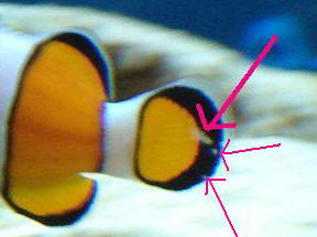 Tomato Clown disoriented 6/11/08 Hi guys, <Artem> I have had a tomato clown for about 6 years in a 55 gallon tank (among corals, yellow tang, algae eating blenny and Gramma). The clown has always been a happy and hardy fish. Two days I turned the lights off in my tank for the night (as I always do) and heard some splashing on the surface of the water. I turned the light on and saw the tomato clown on its side on top of one of my powerheads which was close to the surface. One of it's fins was out of the water and it was gasping half air, half water. I pushed him pack into the water. It forcefully jumped back into the same position. This continued for a bit. Then it frantically swam to the other side of the tank and did the same with the other powerhead which was sitting deep in the tank. The clown was breathing heavily. The next day it was swimming as usual, however in the evening I noticed that it wasn't eating. As soon as I turned the lights off again the next day, same thing happened - it looked like it was disoriented in the dark and was charging across the tank, laying down on the side here and there from time to time. Sorry for the lengthy description, but I can't imagine what it could be. No visible signs of parasites, etc. I have made no changes to the water, other than, on the day before it happened the first time I: a) did a regular water change; b) changed the light bulbs to new ones (2 VHOs - 10,000K and Actinic); and c) cleaned the insides of the protein skimmer. Do you have any solution, please? Thank you Artem <Mmm, perhaps this clown made a mistake... got too close to the powerhead intake. Clowns do often come to "associate" with powerheads in captivity... as symbiont substitutes... and maybe conditions are so dimly lit/dark that it just got too near... I'd leave a bit of light on outside the tank during the night. Bob Fenner> Clownfish behavior: 5/24/08 Hi guys. <Hi there.> Quick question: I have a small tank (30 gal) with a six line wrasse and a small Percula clownfish, plenty of live rock. I am in the process of upgrading to a 55. <Excellent. The wrasse will appreciate the extra swimming room!> Both fish seem healthy, water parameters are good. The clownfish has always stayed close to the top corner of the tank, especially when he "sleeps". I assumed this is probably normal for a clownfish. <Certainly not unusual for these little guys, particularly in systems lacking a host anemone (no need to go get one though).> For the past few weeks that is the only place he can be found. He is fed a variety of reef flakes & mysis shrimp and eats normally. <Good> Will swim down a little for food and once in a blue moon he ventures around, never goes very deep, but mainly just bobs/swims at the top with his dorsal fin above the water like a shark :-) day and night. I was worried it was a swim bladder problem but he seems healthy. Do you think this is normal? <Heheee! In as much as clowns can ever be considered 'normal', yes! These neat little fish are nothing if not entertaining and sometimes surprising when it comes to the various quirks and odd behavior they can display. Outside of the possibility that the wrasse is acting aggressively towards the clownfish (and scaring it into the corner), I'd say that this is fairly typical behavior and nothing to be concerned about. It will be interesting to see where the clown resides in the 55g!> Thanks! <You're very welcome! Take care and congratulations on the new tank! --Lynn> Clownfish, behavior 5/12/08 Hello, <Hi> I have been searching for the answer to this question and couldn't find anything specific to this problem'¦. I have a 30 Gallon 4 year old tank with a Refugium and protein skimmer attached. There are 5 fish in there: 2 clownfish, coral beauty, <Will need a larger tank.> Small yellow headed jaw fish (this dude LOVES chopped scallops J and will eat out of my hand!) <Neat> and a Neon Goby (Gobi soma Sp.)'¦'¦.Phosphates have been .01 ppm for a good while now'¦nitrates and ammonia are zero. <Testable phosphates may lead to algae problems later on, try to find the source now before it gets out of hand.> Problem is that the male clownfish all of a sudden has become aggressive (and loosing it seems as he is the one with the bruises). The female (4 yrs old) had grown some sort of fungus where the side fin joins the body. Seems the goby has taken care of this after a week or so, but every day along the way the male started getting more aggressive'¦now the female is now allowed near the torch coral again but the male is still extremely territorial over the T. coral'¦..( I wanted to have this instead of an anemone as it does not move around etc'¦.it does eat small pieces of scallop as well'¦I have 2 T5 height out. 'Glo' 24' bulbs as well as 2 T12 24' bulbs'¦2 atininic and 2 daylight) '¦any thoughts? Thanks, John <Seems as though the pairing did not work out, which if fairly uncommon but not unheard of for clowns, especially true for Maroons. Sounds like the male is becoming dominant, perhaps because of the poor health of the female, and may be turning into a female. Watch closely, if the aggression continues these fish may need to be separated, as two female clowns of any species will most likely not co-exist in this sized tank.> <Chris> Clown Fish Feeding, Tankmates 5/1/08 I have a question. I had two clown fish in my 75 gallon aquarium and they were really good eaters. I just got a Picasso trigger fish and for the first day the clowns were fine and they would swim with the trigger and eat with him and everything. <More likely they were sizing each other up.> Now all of a sudden they are a little afraid and won't go to the top for fish flakes anymore. <Triggers are quite intimidating and aggressive.> My trigger is getting all the food and I'm afraid that my clowns are not getting any. Is there any way that I can get my clowns to eat something? <Try some sinking pellets, and hopefully they will become a bit more aggressive eating 