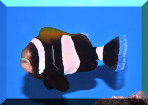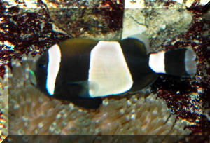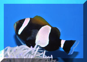 Seychelles Anemonefish. Dark brown bodied with broad lower