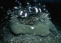 Clownfish and anemones Hello <Hello Mike> I have been trying to setup a percula clownfish breeding tank. Water was taken out of my other tank with high quality, (tested at home and at the LFS) I have an anemone that I have had for two months now, as well as 6 different clowns that turned there tails away from it. I've tried 3 different anemones and still no luck. Is there a way to help the them get along?<No, just nature> When I got the anemone it had a mated pair swimming in it at the time. Only three clowns are in the tank now, what I assume are a mated pair (they where swimming and playing with each other at the LFS, and have been doing so for a while (both are probably 11 months old) and a small juv. I've been told that they can take a few weeks to start using it, but not sure when to try a new one. are the three fish alright or should I have just the two? <Three are fine. Mike, I've post a link here that you should read first. This will more than likely answer your questions on clownfish/anemone compatibility. http://www.wetwebmedia.com/clnfshanmfaq2.htm.> Thank you for any help. <You're welcome. James (Salty Dog)> Clownfish is loving my anemone to death - 12/7/03 Hello, I looked through the FAQs, but didn't see my situation, so I hope you can help. <Let me see what I can do> I have a 55 gallon saltwater tank that has been set-up for about 15 months. It has about 75 lbs of live rock and 5 small fish including a sebae clown, peculiar clown <percula>, 2 damsels, Jawfish, Pseudochromis (strawberry color). <Interesting fish mix> I've had a carpet anemone since the beginning, and a couple of feather dusters. Also a medium hermit and 2 small hermit crabs. <A carpet eh??> My issues have to do with the sebae anemone (8" or so) and the sebae clown fish (2"), the clown has been in the tank for about 12 months, the anemone was added about 3 weeks ago. The clown took a liking to it right away, <somewhat of an instinctive choice> almost seems like it defends it and doesn't leave it. <As in nature. Part of the Clownfish's genetic set of instincts so to speak> Sleeps in it and all. <Becomes a home> But after about 2 weeks, my anemone started not extending all its tentacles (the anemone has purple tips and a green inner body). Turns upside down sometimes also. <not attaching?> The clown continues to agitate the anemone. <Maybe. This is completely natural behavior though. You need to pick up the various books on clownfish and anemone interaction. "Clownfishes" by Joyce Wilkerson is a good book. I really enjoy "Anemone Fishes and their host sea Anemones" by Daphne Fautin and Gerald Allen.> Almost like it is pissing the anemone off. <Could be but to be sure I think there be sure that there is not something else awry here. Maybe the anemone is not healthy from the get go?? Has the anemone been eating?? What about lighting conditions?> Like I said it was fine the first couple of weeks, seemed like the 2 got along, but since, the anemone, couldn't be bothered. <I think its decline is due to some other issue but I wouldn't rule out the clownfish is just "loving it to death". I can't really offer anything in the way of advice per se but I would check through various reef boards and post the question to the many anemone/clownfish keepers.> Any advice? Have you seen this before? I had a smaller sebae anemone a couple months ago, and the same thing happened. <Hmmmm> The anemone died, so I'm worried about this one. <I would be too. It is expected that the anemone and clownfish are compatible at first glance, but.....Do realize though, that it is not uncommon that clownfish can and do harm or irritate their hosts to death. Not sure about specifics or why one anemone take to the clownfish (and vice versa) and why others seem to decline symbiosis with clownfish (or vice versa) but it has been noted many times over. Check around the reef boards is my only advice. ~Paul> Please help. Thanks very much, Geoff Clowns and my LTA Hey Bob! Dude from Miami again! How are you bro? <Fine, thanks> Sorry, got another question for ya - I just put in my new LTA (see pic) last night and he/she is doing terrific! (Pleasant surprise!) Anyway, my question is: Will my Nemo (Amphiprion ocellaris) hang with this LTA and form a relationship? <Mmm, a good possibility, though these two species are not found in natural association in the wild> I know its only been one day, and it will take time, but I'm wondering what the chances are of them hooking up. (Nemo seems mostly interested in eating and looking cute) And, if not, can I get a second, different type of clown that will go to the LTA, and if I can, which type of clown would be my best choice? <Yes... please take a look at the compatibility chart here: http://www.wetwebmedia.com/marine/inverts/cnidaria/anthozoa/anemones.htm> I've read through your FAQ's and articles on clowns, but still a little uncertain. Will a second clown compete with Nemo, or try to kill him? <A possibility... how big is this system? If more than sixty gallons, you've got more than a 50:50 chance they'll "get along"> Or will they sex off and maybe even share the anemone if the second one is bigger than Nemo (Nemo's quite small)? <Very unlikely> I know lots of questions/details - sorry, but I trust your opinion(s), not really anyone else's! Thanks again for all your help and the ultimate site. Dude <Be chatting. Bob Fenner> RE: Clowns and my LTA Thanks for the response Bob! Yeah, I have just a 55 gallon with Ecosystem filtration. I figure a saddleback clown would be my best bet for a second, but I've also read on your FAQ's that Clarkiis go to the LTA as well. Another possibility I guess would be to get another slightly larger Nemo to pair them up, since you said its a good possibility that the ocellaris will hook up with the LTA despite not being naturally assc'd in the wild............. Thanks so much again Bob for all your help!! Dude <Welcome. Bob Fenner> Would it, Could it, Work for Me? >My tank has been set