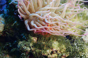 Dog)> Clownfish/Anemone Compatibility Hi, <Hello> I have a settled pair of false percula clownfish and today I put in a bubble tip anemone. The anemone has settled nicely and has expanded decently, but the clownfish show no signs of wanting to lunge into the thing. Is there a way to encourage it to go into the anemone, or will it eventually go in? What do anemones eat? (Since sources say that clownfish brings it scraps of food). <The bubble tip isn't really their favorite anemone although some will call it home. The preferred anemone for the Percs is the carpet anemone, then the saddle (Stichodactyla haddoni) and last the bubble anemone. You can feed the small pieces of shrimp weekly. James (Salty Dog)> Green bubble anemone -II WWM FAQ Crew; Thank you for you help on my bubble anemone. It has now re-opened but is still sitting under my pump unit. I know you're not supposed to move it so I hope it will eventually move on its own. You said that my bubble anemone is not the normal host for my clowns (2 percula & skunk which get along fine and have done so quite a while now) but whenever I go my local shop the are always swimming in and out of one. <Stuart, it doesn't mean they will not adopt the anemone, it is just a preference listing. Stuart, in the future, please, no abbreviations as "4" for "for", and please capitalize where needed. These have to be edited before they can be placed in the FAQ's. Thank you. James (Salty Dog)> Clown/Anemone Follow-Up (3/31/105) Thank you for taking the time to answer. <My pleasure> I wanted you to know that things are getting better. <Great> I've done a couple of 10% water changes, and started feeding the clowns some Mysis shrimp, which they just gobble up! <Excellent! Mysis are great food that most fish will indeed gobble.> My LFS also turned me on to some high-end flake food (big rust colored flakes) that the clowns started to nibble on last night. <Good. Sometimes you really do get what you pay for. Personally, I think premium dry foods are worth the extra cost.> I think that they refused the other food simply from stress. <Often the case.> The clowns seem to have stopped fighting, but the larger one definitely gets the cushy bed at night. I think that the nips on the small clown are starting to heal. The anemone moves around a bit. In fact, she moved underneath some rocks and started to burrow in. So, I moved the rocks from around her so she'd get enough light. Thank you again for your prompt and thoughtful reply! Have a great day! -Lawrence <You're very welcome. Sounds like you're on the right track. Good luck, Steve Allen.> Percula Clowns Rock On Hi, I have had a good look over your site, but cant find the answer to my question. I have two pairs of true Percs in my tank, a black and white pair, and orange and white pair. Over the last few days the larger of my two black Percs, (who I assume to be the female) has been rubbing her belly on a rock with a bed of algae on it, and then settling herself down on it. I have Joyce Wilkerson's book and have searched for this behavior, but can't find anything on it. All I can come up with is that she may be getting ready to spawn. The only other thing l wondered was that she was maybe using it as a host. (I read about another clown doing something similar on your forum). <Very well could be.> I have an H. malu anemone but they take no notice of it. She appears perfectly healthy in every other way. Totally alert, feeding fine etc. Any ideas? I am a little concerned for her. <Sounds like the clowns are just fine. The anemone you have is probably the least favorite of the Percs. They prefer, in this order, the Carpet Anemone, Ritteri, Saddle, and Bubble Tip. James (Salty Dog)> Thanks <You're welcome, Jane> Clown/Anemone Compatibility Hello, Salty Dog! Would a plate-green long tentacle be a good replacement for the anemone as far as my clownfish goes? I would really like for him to have something he can feel at home in. Thanks! Lila <Lila, I don't remember what kind of clowns they are. Let me know. James (Salty Dog)> - Clownfish & Anemone Pairing - Hi- <Hi.> I have been gleaning tons of great info from your site for the last three months, which is when I started my first aquarium. I have a basic 55 gallon saltwater setup with two clowns, coral banded shrimp, brittle star, a couple emerald crabs, hermit crabs, cleaner clams, snails and a porcelain crab that I NEVER see. I also have four feather dusters. I have approximately 65-75 lbs of live rock. I bought a pink tipped anemone the other day from the LFS which is doing well so far. The clowns don't seem to be too interested in getting in, but the person at the LFS said that might be the case. They are a mated pair, but I really don't know what kind of clowns they are... I have been trying to ID them for a little while now. <Suggest you read here: http://www.wetwebmedia.com/clownfis.htm and here: http://www.wetwebmedia.com/marine/inverts/cnidaria/anthozoa/anemones.htm > Any suggestions on the clown/anemone relationship? <Not really - if you read those links I sent you, you'll see that clown fish typically only favor certain types of anemones. Once you've identified your clown fish, you'll know better whether or not you chose an anemone they would favor.> Also, here is the amazing thing... there is a small fish swimming around inside my anemone. <Neat.> I read the post about someone having small black parasitic things inside his anemone, but this is pretty clearly a tiny fish. He swims all up and down the tentacles to the oral disc and back. I cannot get a picture of it, but will keep trying. I really can't believe a fish could be swimming around inside an anemone, but it is. <There are actually several types of fish and not just clown fish which can live in/near/around anemones.> Have you heard of this before? <Yes.> Thanks much Tim <Cheers, J -- > Planning a reef: livestock 3/10/05 Hello Anthony! Me again... I have come to my senses after your last e-mail and the BT