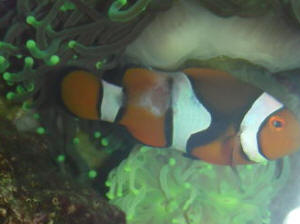 Help! sick clownfish - 1/30/2006 Hi guys! I think I have a sick clownfish on my hands. Yesterday he was acting weird and hiding when he is usually very friendly. Today I noticed that he was just sort of hanging in his Anenome (recently purchased bubble tipped) and not moving and has his face just smashed into it. Now he is just laying on the bottom. He looks like he is having trouble breathing and looks like patches of his scales may be flaking off? <Not good> His eyes are kind of bulging and his white patches have turned somewhat brown. It seems like he has gone downhill fast and I don't know what to do! I don't have another tank to put him in. My tank is relatively new, I've had it for a month and the water tested safe at the store and I just tested it and it was safe as well. The tank is 46 gallons with a coral beauty and a firefish. <Too soon to put this life here...> About 36 lbs live rock, protein skimmer, PC lights, and penguin powerheads. Since I don't have a separate tank to put him in should I place him in a bucket or something until I find out what's wrong and if he is going to make it so he doesn't infect the other fish if there is something wrong with him? <Not possible to tell from here> Also do you think he got hurt by the BTA? <A definite possibility, yes> He really has been just laying in it all day today but who knows. Thanks for trying to save my clown fish! Ashley Mcnulty <Is this a tank bred/reared Clown? If not... likely dying... as "programmed". Bob Fenner> Blue? Clownfish... Too small a system,