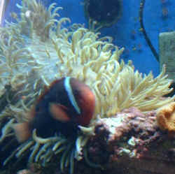 New Fish Hi Anthony, I really want to thank you for all the help you have given to me. Thanks.!!!! <very welcome my friend> Good news, the Sgt. Major Damsel is out. But the clown has not eaten in all day, (he arrived yesterday at 6pm) <sometimes new fish take several days to settle in. In a few cases more than a week> I thought he could be still stressed about the Damsel an the "procedure" to take her out this afternoon. <yes... agreed> My LFS tells me the Clown is a voracious fish and that no matter what it should be eating, <not true at all... even with known hardy species like this clown, there are sometimes shy individuals. Still... do look for signs of stress or disease in the coming days just the same> What is your opinion, I am attaching the picture of the clown and the anemone. <although the picture is a little bit dark, the fish seems to be well. No clamped fins or turbidity to the skin to suggest infection. Most likely it will be fine. Perhaps just a couple days more and patience, my friend> Thanks.. Julio <best regards, Anthony> Newcomer Clownfish Question Hi There I'm from South Africa and I just want to say how impressed I am with your website and everything you do here. Your willingness to help so many people for free is amazing. So thanks from my side for all the hundreds of questions you answer here every month. <Thank you for the kind words!> I have just gone through a 5 week "Fishless Cycle" on my new marine aquarium and finally added my first fish 2 days ago - 2 Yellow tailed damsels and 2 (small) common clownfish. My tank is about 68 Gallons and there are lots of space with lots of hiding places for the fish. My Ammonia/Nitrites are staying at 0 and my SG is about 1.022 and my fish seems to be healthy and enjoying their new home. I have found answers to many of my question on your site so far and my question below is the only thing that I am no sure about yet. I have a question about the behavior of my two clowns: My clowns don't seem to be very active. I don't have an anemone and both clowns immediately became very "close" with the rocks in my tank. Each of them picked out a "favorite" rock/spot and spends most of its time "hovering" around this area. To me it looks like they are using the rocks as a substitute for an anemone and they seem to find comfort and safety when they are close to or touching the rock itself. They also seem a bit aggressive towards each other every now and again. When I feed them they both come out of their hiding places and eat well, which I think is a good thing. But otherwise they just waggle-waggle around close to their "comfort zone" and venture further away only occasionally. It looks very funny/clumsy when they sort of waggle around in one spot, almost as if they cant swim very well, but when they feed I don't see any swim problems. I have done a lot of reading about this and have come to the conclusion that they feel threatened by each other/their new environment and they are busy establishing their territories and "checking out" their new surroundings. I don't see any spots or other signs of physical distress. Do you think I'm correct in assuming that they are just shy/afraid at the moment? <Yes, sounds like pretty normal behavior after being introduced a few days ago. It will take time for them to get used to their new home. -Steven Pro> Kind Regards, Chris Cronje Is This Normal for a Clownfish? Hi Bob, <Steven Pro answering questions this evening.> I wrote to you last week asking about the compatibility of the fish in our tank. Thanks for your help. I have another question regarding our clownfish and it's behavior. Is it normal for a clownfish to somewhat bury himself in the sand and shift the sand with his tail like he is trying to dig a whole to reach the bottom of the tank. <Yes, very normal. Can be annoying to the owner of the tank and possibly can possibly cause avalanches of liverock, but completely normal behavior.> Thanks, Fricia <You are welcome. -Steven Pro> Clowning Around Hi Guys! I don't mean to pester you with my "weekly" question but it seems that with each week that goes by something new and exciting happens in our reef tank - what a fascinating hobby this is. <Yes, truly amazing the things ones sees.> Our reef tank has been up an running for nearly 9 months now. Our two black and white clownfish have been with us the entire time. One is bigger than the other (presumably female). <Correct> They did have an anemone home some months ago (before we found your website!) Sadly, it died and we will not be getting any more. However, the clowns have been fine ever since. <Sorry to hear about the death, glad to hear you learned from the mistake, and yes, clownfish do quite well without anemones.> Last week, the larger clown started playing with our big colt coral (it's about a foot high and a foot wide - the coral, not the clown!). She has even taken to sleeping in it too. The other clownfish still sleeps on the substrate at the front of the tank. I have read from you web site that clown fishes often find "alternative" hosts and I was wondering if this was the case here. <Does sound like so.> If so, will she annoy the coral or damage it? <Possibly, watch that the coral still has good polyp extension and growth.> It's such a lovely specimen and we've had it so long, we'd hate for anything to happen to it. So far, the coral seems fine. Secondly, will the coral hurt the clownfish? <No> If this new relationship is detrimental to one or the other, should I try the home made anemone mentioned on your site made from elastic bands? <If you see the coral continually retracting its polyps or shrinking, yes.> If I may sneak in another question :) both clownfish still swim around the tank together and play together happily, however, the small (male?) clownfish has recently started vibrating his body on occasions when the female is near. Is this some sort of courtship or just more clown-like behavior these fish are famous for? <Possible 