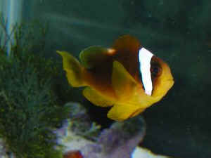 Clown With Strange Stripe? Hi <Hi there! Scott F. here today!> I've just added 2 new clowns to my tank. One of the clowns appears to have a white strip around its mouth-almost like another stripe. It doesn't seem to be affecting it now but I'm worried it may develop into something sinister. Its not a single spot but a definite line. The water quality is fine, done all testing. Any ideas? Cheers Belinda <Well, Belinda- it could be anything from a color variation to an injury, or even an external parasitic infection. However, I would not rush to the conclusion that there is a problem of any sort. Keep observing the fish carefully, provide excellent water conditions, good food, and stability, and be prepared to take action if necessary. In the absence of other "standard" disease symptoms (difficulty in breathing, lack of appetite, external symptoms, like spots or mucus), I'd just keep an eye on the fish. Regards, Scott F.> Grouping of A. nigripes Hi Bob, <Phil> I was checking your website the other day and noticed on one page (I can't find it again to let you know which one) you had the clownfish species listed into their complexes. <Here: http://wetwebmedia.com/clownfis.htm> I noticed (at least on this page) that you had grouped A. nigripes into the "tomato" clown complex rather than in the "skunk" clown complex. <Yes, on the basis of the solid color other than the white head vertical band> After having a pair myself for a short period of time and seeing a few at wholesalers, I began to think that they looked very much like a pale A. melanopus rather that any of the skunk clowns. Is there new literature that puts A. nigripes in the tomato complex or is having them there something that made more sense to you. Thanks for your help, Phil Henderson <If memory serves (less and less), I "borrowed" this classification scheme from Daphne Fautin and/or Gerald Allen. And I think... it's something of a "convenient taxonomy"... an artificial assemblage that serves to "key" or segregate the Amphiprionines for ease of identification only. Bob Fenner> Funky Striped Clown >Crew, >>Person... >I just got this new (false percula) clownfish and it has a strange stripe. On one side the stripe doesn't connect; it's like two half stripes with orange in the middle. >>Likely a captive bred and raised specimen. Good on YOU and the shop that carries them! This change in coloration has been seen in many animals; horses, cattle, sheep, goats, and even foxes many decades ago when captive breeding was attempted. The foxes developed white tips on their tails that is entirely unwanted, and no solution was ever found. This is why foxes must be trapped from the wild even today. >The clownfish seems healthy and everything, I was just wondering if this is normal, or if I have some cool one-of-a-kind fish. >>No, more and more common with all captive-bred Clownfishes. >I've looked at tons of pictures of clownfish trying to find a fish with similar markings, but so far I haven't seen any. >>The variabilities are, well, variable! Your fish is fine, but always unique, just like you. Marina Maroon...Tomato....Marato? Hi all! I just love this website. My tank is 6 months old. Its an 18 gallon with some live rock, three crabs, an anemone, and a clownfish. When I bought the clownfish my LFS said he was a maroon, and since he was a baby he looked like a normal maroon with 3 strips. As he's grown he's lost the last 2 strips and has turned black like a tomato clown. Basically I'm wondering if maroons can lose their strips or if tomato's can be mistaken for maroons? If in fact my "Nemo" fish is a tomato, what is their temperament compared to the maroon. Can I put other fish with him? I've looked around the site a bit, but theirs not a whole lot on tomato clowns that I found. Thanks. Amy <Mmm, no... a Tomato is a... excuse me, Maroon's do change "their stripes" and color quite a bit at times... mostly keyed with change in sex (turning into females)... Yours has the prominent "cheek spine" still I take it? It's a Premnas (biaculeatus). Bob Fenner> Re: Maroon...Tomato....Marato? No actually it doesn't have the cheek spine...unless its so small I can't actually see it. But he or she is about 2 inches long now. So if he/she doesn't have the cheek spine, did my LFS lie to me? <Mmm, can't say from here. Do take a look on fishbase.org (click on the pix shown after looking up the species by common or scientific name)... the spines are very small when the fish are small. Bob Fenner> Clown of A Different Color? Hi, <Hi there! Scott F. with you today!> I purchased two juvenile percula clowns via mail order. I have had them 1 week. They are brightly colored, very active, and eating normally. I noticed the day after they arrived that one of them has a small round white area in the middle of the top fin. It is not a lesion , nor does it look like a grain of salt or a bump, or any of the other commonly described diseases. It looks like its internal (under the skin). It almost looks like a color variation. Does this occur with percula clowns? There has been no change to the spot or in the behavior of either fish for the entire week. Any thoughts? Thanks, Laurie <Well, Laurie, it is entirely possible that this is simply a random genetic color variation. Many of the clownfish sold in the hobby are captive-bred, and such "sports" or "anomalies" do happen from time to time. As long as your a convinced of the health of the fish, It should be fine. I would not, however, allow a fish with such a color anomaly to breed, so that the "integrity" of the species' gene pool is maintained. Enjoy! Regards, Scott F.>