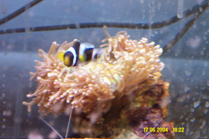 Anemone/Clown Problem 06/02/04 Hi Bob, My name is Jorge and I have an anemone/clown problem. I bought a brown carpet anemone from my LFS. I bought it about a week ago nice and healthy. When I first put the anemone in the tank it was just moving around trying to find a place to settle. Then after the third day it stayed in the front left corner of the tank. Now, I have three false percula clown fish and at first they didn't notice the anemone, but last night I saw one of the clowns swim down and make contact with the anemone. It stung him and he swam up quick, but he went back down. Started swimming on it and around it with the anemone not stinging him. Soon another clown fish swam down and joined in. Later on that night I thought they were placing food in the mouth of the anemone, but they were eating the inside of the anemone. << Odd, and disappointing I'm sure.>>The carpet just opened up its mouth and the inside of it looked like white noodles. The clown fish were just picking at it. It stung them a couple of times but they kept coming back. I took it out for now, but what should I do? << I would place the anemone in another tank and let it heal up. It should be in a well settled aquarium with much light and water flow. However, you will eventually have to risk it again with the Anemonefish.>>Is there anything I can do? << Do your best to provide it with a secluded location. One idea that has worked for others before is to place a basket over the anemone. Depending on the size of your anemone this may or may not work. What I would suggest is using a strawberry basket from the super market. You know those flimsy green plastic baskets? If you can use something like that cover the anemone, then the fish can't get to it, while it heals. >>I know my fish aren't hungry. I feed my fish (tang's) seaweed or frozen foods every other day, but I feed the clown fish flakes every day. << You may have to feed the anemone as well, but more important to keep it safe.>> Please let me know. Thank You!! Jorge Elizondo << Adam Blundell >> Anemone-Anemonefish Relationship I just purchased a rose bulb anemone, and am trying to decide on the most appropriate clown as it's host. I really like the anemone itself, but am not too keen an many of the natural symbiotic clowns. In the opinion of the experts at WWM, is there a chance that a tank raised true percula would accept a bulb anemone, even if they aren't associated with them in the wild? <Yep, but it may take a few months. I've seen clownfish associate themselves with all sorts of anemones, whether they occur naturally in their habitat or not. It's not guaranteed, but it could happen> Finally, do clownfish actually have a preference for certain anemones in the wild, or is it simply a matter of take what's available in that part of the world? <Any clownfish is going to have several species available to it, and they're going to have preferences among those species, yes> Thanks, <anytime> Clownin' Around <M. Maddox> Anemone In Peril? Hi! <Hi there! Scott F. here today> I have included a picture which came out at least clear enough for you guys to see our problem. We've had out BTA for about 5 weeks now and just a few days ago we've noticed that half of it's tentacles are gone! On one side, it has normal green bulb tipped tentacles and the other side for some reason just started shriveling up and now are gone! We can't seem to find anyone who has had this problem. The entire 5 weeks we've had the BTA, we also had a Maroon Clownfish that has "occupied" it for lack of a better word. Here are all the things we have in the tank: (first of all it's a 55 gallon tank with a pro wet/dry filer) 3 Bumble Bee snails, 2 tiny blue algae hermit crabs, 1 cleaner shrimp, 1 Peppermint Shrimp, 1 grazer snail, one Kenyan Tree, one Frogspawn, one mushroom, one Yellow Tang, one Powder Blue Tang, one Diamond Watchman, one 4 Striped Damsel, one Yellow/Purple Chromis, 1 Maroon Clown Fish, 1 Coral Beauty and 1 starfish. <Wow! That's quite a load in a 55 gallon! Do consider larger quarters for all in the very near future!> Our lights are one 65 watt daylight bulb and one 65 watt blue light bulb that stand approx. 3 inches from the top of the tank. The BTA has stayed in the same place for the past 3 weeks. Any idea what would cause the BTA to just lose tentacles? Vince Urban <Well, Vince, I wonder if the anemone "lost" the tentacles, or if they are merely retracted? Regardless, I'd start by running some tests for basic water quality parameters, such as ammonia, nitrite, pH, alkalinity, etc. Detectible ammonia or nitrite can, of course, be problematic, as can high levels of nitrate. The other possibility is lighting. I don't think that your lighting is intense enough for long-term success with the anemone. Much brighter light is required for success (Such as metal halide). The other thought is that you need to observe carefully to see of someone is harassing the anemone. Finally, the other thought is that you may need to provide more food the animal, as they do like to eat. Do check out all of these possibilities, and take appropriate action. Regards, Scott F.> BTA and clowns Hi Bob and Crew! <Hi, Graham at your service.> I first want to say that I have thoroughly enjoyed wetwebmedia.com since I discovered it a couple of months ago. It has provided me with a ton of information which I have really appreciated! <Thank you!> Most everything I've wondered I've been able to find in previous faq's/articles but I'm having trouble with one specific thing. I have decided to try and keep my first anemone and really want to do this right. After much research I have decided on a BTA (preferable tank raised) with a pair of maroon clowns or Ocellaris. I have good rapport and trust with one certain local fish store and decided to have them obtain all three animals for me, pair the clowns up and "host" them with the BTA prior to my purchasing them. (I informed them I would prefer Ocellaris over Maroon due