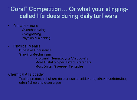 Too many people envision the reefs of the world to be some aquatic equivalent of "Bambi crossing a meadow" with some sort of miraculous "balance" amongst the life that occurs there. This is a dangerous precept for aquarists, as these areas are veritable battle zones with the life competing for space, food, mates... at a "tooth and claw" level. Most all benthic life we keep continues with this behavior in captivity. Overgrowing, shading, poisoning, stinging, eating its neighbors... Sometimes at great distances. Herein will be my statements re approaches to alleviate the major thrusts of this issue with stinging-celled life... All out competition is an omnipresent situation in captive reefs. Proper set-up... Starting with smaller specimens, placing the less noxious to more in order, careful maintenance... and observation are all useful tools here.