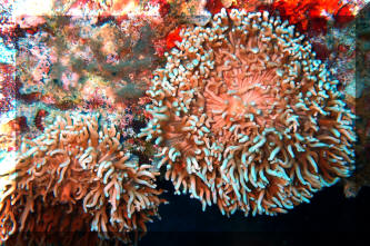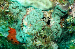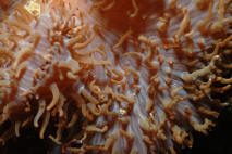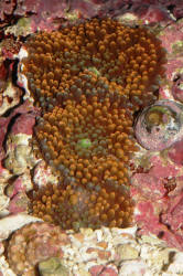 Genus Rhodactis: Oral discs covered by pseudotentacles that are typically branched. Edges of discs often have toe-like tentacles. Generally there is a clear of tentacle area around the mouth.