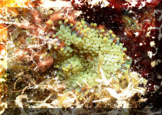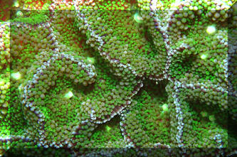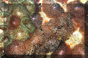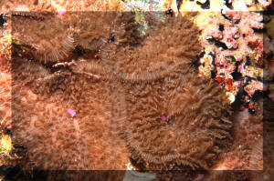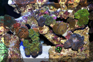 Selection: General to Specific: As with their close relatives, choose specimens that are fully open with no visible dead, whitish, (missing) material. Coral anemones are collected with a substantial chunk of limestone "rock". The piece snapped-off must not have torn too much of the colony asunder. Though marketed as single versus multiple polyp "pieces" for the purpose supposedly of lowering cost per sale (?), my strong preference is for the latter. Do not be concerned that the individual polyps may be differently marked as this is quite normal. Similarly, be aware that they change shape cyclically during light/dark/feeding et al. conditions. Healthy individual's whose Zooxanthellae are in decline should be avoided. These necessary endo-symbionts are the majority of the color seen, so select for well-colored specimens. Corallimorpharia are one of the exceptions regarding whether to gamble on just-arrived shipments, develop a wait-and-see or deposit-and-wait stance. The sooner a desired specimen is put in an appropriate (particularly concerning lighting) environment, the better for it's health and color. Some author's suggest isolation and antibiotic treatment regimens to reduce the possibility of fouling. In the course of handling several hundred specimens I have found this to be unwarranted. Environmental: Conditions Habitat Corallimorpharia are found in areas of poorer water quality than many true corals. This fact has been proposed to explain their greater tolerance of hobbyist-generated/allowed pollution. They are found in shallow tropical seas in moderately lit and non-turbulent conditions. Chemical/Physical Some general water quality control limits to be monitored: Maximum nitrates 30-40 ppm, minimum pH 7.8, min.-max temp. 72-85 F., negligible ammonia, nitrites, min. water density 1.020... Lighting is important. For folks with fluorescents only, place your false corals near the surface. For metal halide, halogen users deeper placement is suggested. Too little light results in specimens' polyps losing color and cupping-up in shape. If you cannot increase intensity, extending photoperiod to may help. I'll even "plug" for actinics this time/place. Unlike leather, et al. corals, coral anemones do not do well in strong currents. Direct power heads etc. not in their direction. Most specimens are collected from the Caribbean (Rhodactis, Ricordea) and the West Pacific. Cold water species, like our local Corynactis californica, it should go without statement must be kept in "chilled" systems. They will eventually dissolve in warm waters. Biology/Other Some species have fluorescing tentacles! Check this out under actinic lighting. Gorgeous. Filtration Simple enough. Even minimalist approaches of common undergravel systems have met with success. Suit yourself. Behavior: Territoriality