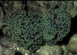 Coral ID by Text - 8/20/03 Hi, <cheers> I wondered if you could help me identify this coral, have looked at hundreds of web pages but just cannot find it. <was a pic intended to be attached, my friend ["this coral"]? If so, it did not carry through> At first glance it looks like a fluorescent green coralline algae. It is spread over dead rock much like a coralline would, however it is not hard, it is soft. It also has little patterns in it as if it may be comprised of lots of small organisms. Under lights it is a very bright green and is one of the most beautiful corals I have ever seen. I only have a very small bit of it, and hope to find out what it is to make sure I can grow it more. I know this description may be somewhat unscientific, but if you could give me a name or two of what it might be, I could look them up for further research. Cheers, Alastair <without a pic, we need much more info to help you, bub. Hard coral or soft coral (skeleton underneath?)... size of polyps, etc. Even then it's a best guess. Do send a clear pic and we'll be able to give you a prompt ID mate. Best regards, Anthony>