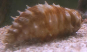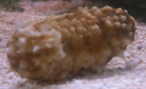 Fenner> Re: Indonesian Sea Apple 8/15/07 Thank you very much kind sir, have spent most of this morning on the site (which BTW I was excited to see referenced as a, well, reference in the last issue of Tropical Fish Hobbyist Magazine)! Alec Parodi <Ahh! Thank you Alec. Bob Fenner> Sea Cuke that likes to stay on front of Tank - 3/7/07 Hi to all. <Hello John. Brandon tonight.> I have a Sea Cucumber that I've had for about 8 months in a 58g 4"DSB . Included livestock include 1 Yellow Tang, 1 Niger Trigger <You will ultimately have to move this one to a larger tank.>, 1 Maroon Clown,& 1 OL Anthias. Inverts are 1 Porc. Crab ,1 Blood Fire Shrimp & 1 Sand Sifter Star. I HAD about 40 mixed snails <Had?>, My parameters are always : Sal. 1.023-.024,PH 8.2, Ammon. 0, Trites. 0, Trates. 0, Calc 400,Alk. 2.8,Phos 0 My Question is this: I noticed 3 days ago that my Cuke was on the front of my Tank, Curled up & like a snail. Not moving most of the time, but if it did it was maybe an inch in several hours. While cleaning my tank side yesterday, I knocked him off and now he just lays on the sand . He is still alive because when I moved him, he would move just a little. <Be careful moving it around. You DO NOT want to make it mad.> Should I remove him, or, because it may be dying, <For safety sake, and the sake of your fish, I would move it to a QT tank.> or since I've seem to of lost about a dozen snails( because of temp change), do you think maybe that may have a part in it? <Very possible. The Holothuroidea like very high quality, stable water. Please see here, http://www.wetwebmedia.com/seacukes.htm.> Don't know what kind of Cuke it is. It has yellow spikes, Gray/off white body and black specks. <Sounds like Colochirus robustus, but I really can't tell without a picture.> Thanks <You are welcome, hope this helps. Brandon.> Tiger tail seems to be stuck 7/19/06 Hi people, I have a very odd situation, bought an orange tiger tail cucumber last week to help with the cleaning. <Mmm... not really useful for this in but a few types of settings> It hid for 6 days, under inspection we discovered it's head or tail, seemed to be stuck in a large empty snail shell, <No, not stuck... can get back out of anything it can put its head into> so we dislodged it. It moved a few inches, and now seems to have its head or tail stuck in a rock crevice. What is it doing and why, should we help it, or leave it alone. Kind of worried. Thanks, Chris Wheeler <May be unhealthy for whatever reason/s, but could more likely be just "doing what they do"... Please read here: http://www.wetwebmedia.com/cukebehfaqs.htm and the linked files above. Bob Fenner> Cuke Behavior 4/1/06 Hi Crew, <Hello Tom> Sometimes animals just have their own reasons, but I'm curious if you can shed light on a change in our black sea cucumber's activity. For about a year, since we got it, this Cuke has been happy crawling around the sand bottom doing what Cukes do. But, for the last couple of days it has been cruising around the top perimeter of the tank, on the glass just below the waterline. It's in a 2 year old, healthy 125G reef tank with 9 various fish, and about 25 corals, mostly sps and a couple LPSs, 1 derasa and a couple of skunk cleaner shrimp. Tank param.s are all copasetic and stable (let me know if you want all the details). No changes to the livestock for over 6 months, and everyone else seems normal. I now worry about the Cuke getting stuck in the overflow or closed loop intakes. I've gently placed it back on the sand, but then it crawls back up to the top. I'm wondering if you know of some sort of event (maybe reproductive or age related?) in the life of a Cuke that drives this change in behavior. <I'm guessing two things. One, you may have a hydrogen sulphide buildup in the sand that the Cuke isn't fond of. (Do you vacuum the substrate during water changes? Number two, the Cuke may not be finding enough food on the bottom and looking elsewhere. Am posting a link to an article regarding the Cukes. http://www.wetwebmedia.com/seacukes.htm> Thanks, <You're welcome. James (Salty Dog)> Tom Pink cucumber ends