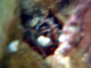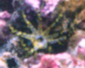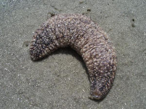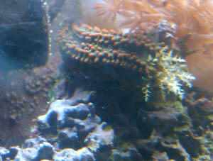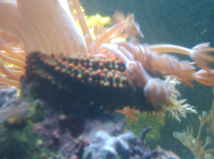 Fenner> Found a strange "worm" thingy Hello! What is it??!! I've search a few of the FAQs and I can't seem to find the answer to my question... I don't want to say "it looks like a worm" because I don't know want to put the wrong picture in your head. (Since many people have different ideas as to what is a worm and what isn't). I'll try describing it. It's about a centimeter and a half long. It is brown on top with a dull yellowish underbelly, and one end is dull yellow. It's about half as thick as a pencil. And has small brown "knobs" on it that have a black dot on the tip. I've also seen a couple small, thin yellow arms on the side/bottom of it. I found something that looks like it here, kind of: http://library.thinkquest.org/J001418/seacuc.html But it doesn't have as many protrusions as that one... I can't tell which end is the head... Any help in the right direction would be great, thanks! Jason Thomas France >> <Hmm, well, it does sound like some sort of Sea Cucumber... and there are a bunch of types it might be... The important bit is that this animal is likely not deleterious... and so, unless it gets really big, or numerous... I would leave it be... and enjoy it! Bob Fenner> Identification question I took the attached photograph in about 15 feet of water off the coast of Dominica. The area would best be described as boulders/large rocks. I was at the end of the roll of film, so I decided to take the shot with a 20 mm lens (as opposed to a close-up shot), co the definition could be better. Any help with an identification would be appreciated - even just a nudge in the right direction. <Hmm, looks like the end of a Donkey Dung Sea Cucumber... Holothuria thomasi... there's a couple of pix of this species on our site: http://WetWebMedia.Com/seacukes.htm Bob Fenner> Thanks Shaun Critter ID I will try my best to describe it. First off, I have only seen it twice, both at night. It looks kind of like a huge snail, but has no shell. It is mostly flat and tear-drop shaped. About 1 inch to 2 inches long, maybe a little longer. It has antennae and little black dot eyes. It suctions up to the glass with its body and moves around quite quickly. It has a separate head and its little circular mouth sucks up to the glass and moves around like a vacuum cleaner very quickly. It is light-greenish brown in color. Like I said, it doesn't have a shell and is thin, but has kind of a curved back that looks to have darker sand or something on it - not sure. My concern is that it is pretty damn big and moves pretty quick. I would say it might be a snail without a shell, but I don't know, I have never seen one of those. Thanks for the help with the ID. <Mmm, curiouser... a separate head? Moves quickly... as in faster than "the average snail"? There are worm, mollusk groups that this stranger may be part of... rather than my fave guess group- sea Cukes. If it were up to me, I'd take some pix, show them about on the Net. Bob Fenner> Loch Ness Monster in my tank! Hi Bob, <Hello> I'm new to reef keeping and have found your site invaluable. I've made mistakes from my own lack of knowledge but I've also run into problems with misinformation from my LFS. I've decided your book goes with me to the store so I can look up any new critter before I bring it home. <Hmm, wouldn't it be great (or shall I ask, when will it be so?) to have the Worldwide Web available at the shops? With "bookmarked" sites, sources of information, opinions... like bulletin boards, chatrooms, specialty sites... to render, offer such input?> We've had a 46 gal tank with no coral set up for a month. It has 50 lbs of cured Fiji LR + couple pieces of cured Tonga, 40lbs of LS, 20 lbs of crushed coral substrate. I'm using a HOT Red sea Berlin skimmer with a FB 300 Lifeguard Fluidized sand bed filter, a CPR 12" AquaFuge, for circulation 2 AquaClear 301's, and one ZooMed PowerSweep 226. The system is lit with 144 watts. of power compacts. The water conditions are ph 8.1 nitrite .1 nitrate 5 ammonia 0-.1 Phosphates 3 <Three? Hopefully 0.3 ppm... Three is too high... as you likely are aware> Tank is stocked with 4 peppermint shrimp 20 blue legged hermit crabs 1 sandsifting starfish 1. 2" mandarin (He is fat and happy-I take extra special care of feeding him after reading on your site!) 1. 3"-4" Midnight Tomato Clown-am taking him back to LFS-hides all the time and picks on other fish-lesson learned on purchasing too mature of a fish <You are correct> 1. 2 1/2" Yellow tailed damsel 1. Purple tipped bubble anemone-I read you don't prefer this but was told it would help clown-who's scared of it- and was supposed to be easy first anemone. 1. purple Nudibranch We purchased 2 pieces of what was supposed to be Cured Tonga LR. We have two identical, unidentifiable creatures. They're scary! The one we've battled with is approx. 6" long, 3/8 to1/2" in width. We thought it looked like a snail or slug but it's surface is hard. It has no apparent eyes or head or tail. It's grayish, tanish and has small nubs or spikes along its outside edge. It also has black elliptical patches that run down its back in the center. It's twisted around in the LR and it comes out of its hole at night. It is flat like but thick when it's out. It moves slowly almost like the Nudibranch. But when we tried to pull it out with plastic tweezers we discovered that its back is shell-like and hard. It is very strong. My 6'3 and 210 lb. fiancĂ©©? couldn't pull it out or even squeeze it. The tweezers slipped off and left a small scratch on the casing. <Take care not to pull too hard, break this organism... more trouble than leaving it be... Likely some sort of sea cucumber... as its hardness points> Now, you ask, "Why haven't you moved the LR to remove the creature?" Our purple tipped anemone has just attached to the LR. So the questions are... What is it? Is it bad? Can we move the anemone and take LR out? How do we get creature once out of tank without killing everything on LR? <Perhaps try 