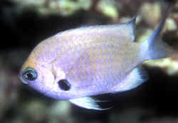 Damselfish is a finicky eater Hi < Hello. > I have had a 4 stripe damsel that I recently purchased. I put it in a quarantine tank and it was adapting as usual. After a week I gave it some live brine shrimp and it loved it. But a little too much. It was a week ago since I gave it the brine shrimp and I haven't given any more since. Now it will accept nothing else, but krill and sometimes a small piece of Mysis shrimp. I have tried feeding it everything I have which is a dozen or more types of food and it will accept nothing else. < Have you tried Cyclop-Eeze? Nothing turns down that bright red color. > I am sure this is really not a large enough variety for a healthy diet. Please give me your advice of how to get this fish eating again. < I would try mixing a couple foods together. Like offer something stirred up with the brine shrimp and see if he eats while eating the brine. Otherwise, my best advise is to keep feeding a variety and let him eat when he gets hungry enough. This may not work for all fish, but damsels I think they will eat (voraciously in fact) before actually starving. > Thanks, Jed < Blundell > Damsel hasn't eaten for 30 days 4/13/04 Hello everyone: I have a blue velvet damsel that will not eat. It has been 30 days now. The damsel had been eating voraciously (flake food and some frozen shrimp. ) Once I noticed he would not eat I moved him into a larger tank 55 gallon( he had been in quarantine for 2 months while I cycled a 55g with ammonia). This is the only animal in this 55g tank. I read many of your articles and it seems it could be internal parasites or constipation. The damsel stopped eating abruptly. His eyes are clear, his color is perfect, there is no bloating, he has lost very little weight. He is responsive though once I moved him to the 55g. He was non responsive for about ten days and would just swim the entire length of the tank constantly without resting. I have noticed white and clear feces and also the two corners of his tail are missing. <The symptoms could be associated with parasites or infection. White feces has also been associated with cyanide exposure, but cyanide usually kills early. As long as the fish looks healthy, I would just wait it out. It could be eating some amphipods and/or copepods as well.> The S.G. is 1.027, Ammonia .25, nitrite 0, nitrate 0 and PH 8.2. I have been having trouble with the ammonia even though I am feeding lightly. I do a water change once per week. I have been using an undergravel filter with a protein skimmer but I may change to a sump if that would be a better choice. In the future I will stock the tank with fish mainly, a couple of hermit crabs, tiger cowry and cleaner shrimp. <Please verify your ammonia reading with another kit. If the ammonia reading is accurate, it could be contributing to the problem. As an aside, I generally recommend against UGF's for marine tanks in favor of live rock for the simplicity and stability it lends to the system.> I did try using 1Tlbs of Epsom salts, in 5 gallons of water in a bucket with an airstone and heater. I used the water I remove from a water change and left the fish in there for three hours. If the fish is constipated should I have left him in longer or added the Epsom salt to the main tank. <I don't think there is a benefit to Epsom salts here.> Does this fish have internal parasites? I read somewhere on your site that if the fish is not eating you cannot treat him and that even if the fish takes food the treatment may not work. Any ideas? Thank you <I would suggest moving the fish back to quarantine and lowering the specific gravity to 1.012 over a few days. Hold at 1.012 for at least a week or until the fish starts eating. Marine fish expend a significant amount of energy ridding themselves of salt. Lower SG allows them to spend more energy fighting illness. Do not lower the SG in your display! It will damage or kill any beneficial bacteria and critters that are present. Best Regards. Adam> Damsel on A hunger Strike? Background: 55 gallon salt, Eheim 2233 canister, skimmer turned off (but air stone in tank) for now because I added my first, single Damsel 01-03-03. My tank cycled for about 3 months prior due to my obsessiveness--and lack of funds for a few odds and ends. I have done everything right, I am sure. When I got the damsel it was fine immediately. Lively, and eating fast. But now it won't eat. I bought 2 types of food and still won't eat though it would at first. The damsel is still lively and even darts at me (very aggressive) when I am near the tank. I kept marine fish before and never have I not seen a damsel not eat unless about to die. This one seems healthy otherwise. Any ideas? (Also, I have done two 4 gallon water changes since introducing it.) Thanks. <Well, I'd say that the sudden lack of appetite of this fish is probably the result of some form of stress...The stress event may have been a sudden variation in water chemistry, temperature, or even the onset of disease. I'd perform a re-check of your nitrite and ammonia levels...Do run the skimmer at all times- it's your first line of defense against potential water quality problems. Maybe perform another small water change if the water chem is off. Perhaps you might want to try another food or two- it can't hurt at this point...Sometimes, fish do go "off feed" for a few days for now apparent reason, only to begin eating ravenously days later...Just be patient, don't give up- observe him closely...Good luck!> Damsel Rescue Dear Mr. Fenner, I recently rescued a blue damsel from my university where he'd been living for three years in a tank covered with at least three kinds of decaying, slimy algae? <Yikes, thank goodness> They didn't care for him and he never was fed. He subsisted on sludge. The only reason I got him is because I kept visiting the department with any suggestions I'd read about (I'm really a freshwater aquarist). Their building was condemned so they had to 'get rid of him'!! He would hav