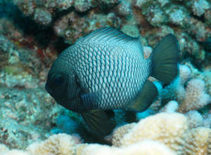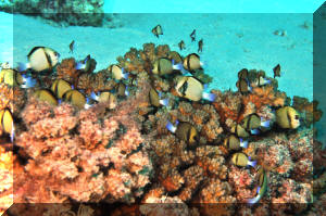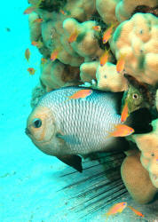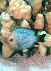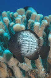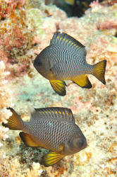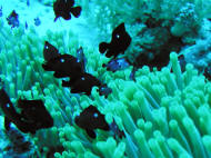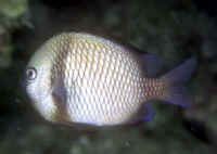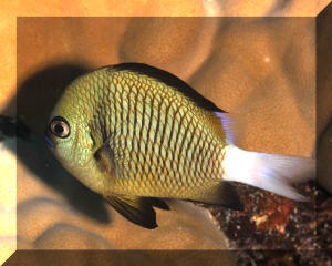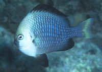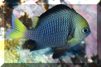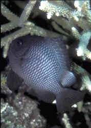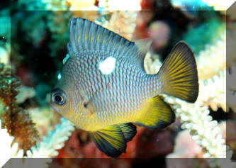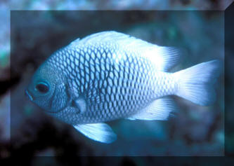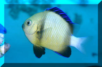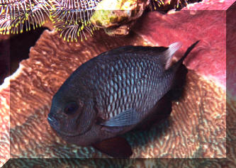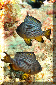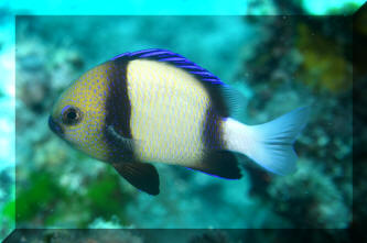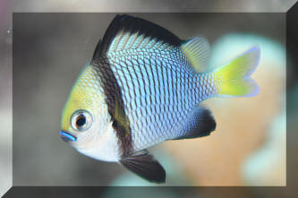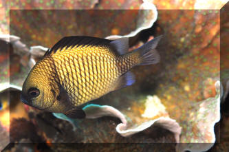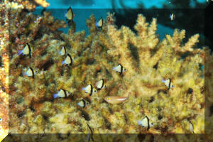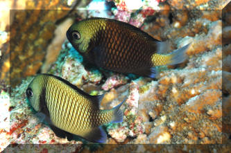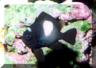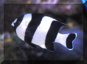 Range: Dascyllus species are confined to the tropical Indo-West Pacific overall; shallow reef areas are typical habitat, always near close cover. Size: How big have you seen these fishes? Three and Four Stripes attain a good four inches (10 cm.), the Domino and Hawaiian can reach half a foot. Selection: On any given day the three principal species are readily available from dealers. Mixtures of Three-Spots or Dominoes (Dascyllus trimaculatus, three and Four Stripes or Humbugs (D. aruanus, D. melanurus) Yellow-Tail Blue and Blue Damsels (Chromis cyaneus et al.) various Chromis, Beau Gregorys, Sergeant Majors (Abudefduf species), so-called "deep water" damsels (Glyphidodontops species et al) among others are variously offered as the lowly low-end miscellaneous damsels. The following criteria for picking out healthy Dascyllus apply to all marine fishes, but in particular the damsels: 1) Buy from a healthy system; one with no dead or dying specimens. The majority of losses of these fishes are due to either shipping problems, or poor stock management. Look for signs of gill burn/ammonia poisoning from recent shipping; cut-marks on damsels from mis-handling and aggression and avoid that tank. 2) Beware of behavior problems; of tanks of damsels with individuals hanging, drifting around having "private meetings". or a set-up with one alpha damsel beating all else senseless. 3) Don't buy the smallest (less than 1/2 inch) or the largest (as a rule, more than two inches long) individuals available. Small ones die too easily and large ones don't adapt well to captive conditions. 4) Buy and introduce your damsels all about the same size; this reduces inter and intra-species aggression. 5) Buy stock that have acclimated-stabilized. The "top three" Dascyllus damsels that have been adequately acclimated and held for just a week or two are extremely hardy; one's that are shipping-stressed ofttimes perish mysteriously. Environment: Dascyllus damsels are easy to keep in aquaria; they are not fussy in terms of water chemistry and physics. Any amount of light, dim to bright, will be okay. Natural or synthetic water makes no difference in terms of vitality or reproduction in captivity. A pH of 8.0 to 8.3 is favored; no ammonia, nitrite and as low a concentration of nitrates as practicalis the rule as with most marines. Though dealers purposely overcrowd their systems, this should be avoided; grant your Dascyllus five to ten gallons of water each at a minimum for small to adult sizes. Dascyllus, like other small marines must have hiding spaces. Provide coral, shells, plants- some nooks and crannies for social-psychological shelter. Tankmates Are you aware that small damsels are a dietary mainstay for most fishes whose mouths are large enough to accommodate them? You will be if you don't measure those would-be predators before introduction. Not to simply state that Dascyllus are pushovers however; anyone who has not been challenged, indeed bitten by these mighty mites, has not had their hand in their tank or been diving in their waters. Dascyllus can/will hold their own with any organism not big and fast enough to engulf them. Acclimation: At the very least a simple freshwater dip/bath, with or without other additions ought to be employed in transferring Dascyllus from your supplier to their new home. More ideal is an intermediate stay in a quarantine/hospital tank for "hardening" and ensuring the elimination of pests and parasites. Foods/Feeding/Nutrition: Dascyllus damsels are dominantly planktivorous in the wild, eating water-borne zooplankters, secondarily feeding on benthic algae. In captivity they accept all foods greedily. In fact, you may have to actually "beat them with a stick" to allow less robust feeders a chance at the table.