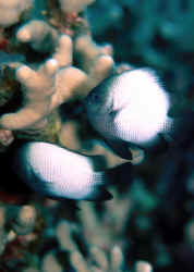 Damselfishes are an extremely important group of tropical and sub-tropical marine fishes, for the wild and saltwater hobbyists. Damsels provide a vital link both as reef forage fishes as well as excellent beginner marine aquarium specimens. What makes them so great is their diversity, beauty and tolerance of chemical and physical conditions, "interesting" behavior when crowded and general compatibility with fishes and invertebrates. To top all this off damselfish species normally accept all types of food eagerly and are very disease resistant. Amongst the premier members of the family, the damsels of the genus Dascyllus reign supreme in many ways. Some are tough beyond simple aggressiveness for their size. Though not bedecked in brilliant warm and cool colors as other damselfish genera, their simpler black and white patterns are more than made up for in hardiness and antics. Here we will cover which species are preferable, how to go about selecting the best specimens, avoiding overly agonistic behavior, and a few of my favorite biological/aquaristic insights. Classification: Along with the clown-anemone fishes (Amphiprion) damselfishes make up the family Pomacentridae, with some 25 genera and 320 species. According to Dr. Gerald Allen, the foremost authority on the systematics of the group, the genera Acanthochromis, Chromis and Dascyllus should be placed together in a subfamily, the Chrominae on the basis of shared structural characteristics (see Allen, 1975, p.34). Of the nine described Dascyllus species three are "fixtures" in the aquarium hobby; the Three-Spot or Domino, Dascyllus trimaculatus, Four-Striped or Blacktail Humbug, Dascyllus melanurus, and the Three-Striped or White-Tailed Damsel, Dascyllus aruanus. Every seasoned marine aquarist has seen and used these for testing, breaking in nutrient cycling, ditherfish and general amusement. Of similar appearance to the three-spot and unfortunately, temperament, is the Hawaiian endemic, Dascyllus albisella. More striking as a juvenile, with darker black and a bolder, larger triangular body spot, the Hawaiian is no match for the domino in sturdiness. I'd suggest Dascyllus albisella only for a biotopic, or serious study set-up. The blue-spotted Dascyllus carneus and aptly named reticulated Dascyllus reticulatus are occasionally offered in the trade in the west, and tend to be of irregular touchiness. I've seen whole shipments "crash" without probable cause. Much better are the three "standards" listed above. Not to leave them out without mention, Marginated Dascyllus marginata, and Strasburg's Dascyllus, Dascyllus strasburgi are rarely found in the trade other than as specialty orders (Strasburg's is from the Marquesas, marginates from the Red Sea), "contaminants" or "mixed" in assorted damsel shipments. My limited experience, first and second hand, with these other Dascyllus places them in the same aquarium-useful box as the Dascyllus carneus and reticulatus; that is, not very.
