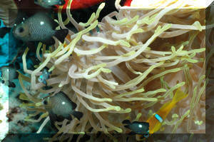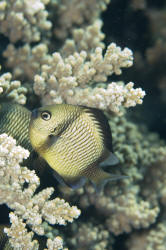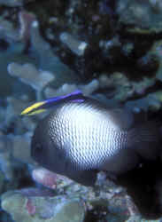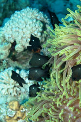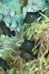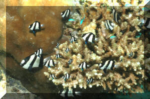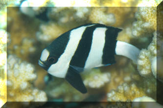 Other Biology of Note: Geez, how much time/space do we have? Chemical and sound communication (yes, they're noisy) may be explored in a literature search and in your own tanks. How long do they live? Dascyllus damsels have been kept in captivity for more than ten years. Young to moderate size D. trimaculatus and the Hawaiian sibling species D. albisella are frequently found in the same sort of mutualistic symbiotic relationship as Clownfishes; cavorting in and amongst sea anemone tentacles. Sometimes right along with Amphiprion species! Close: The three principal species of Dascyllus used in the hobby, the three-spot, three and four stripe, have proven to be indispensable to saltwater aquarists. What more could you ask for? Their inexpensive, amongst the hardiest of marines, accepting of the widest range of conditions, and eat like no tomorrow. Do you have a friend who's considering a salt set-up? Do direct them to these damsels definitely not in distress, the top three Dascyllus. Bibliography/Further Reading: Allen, Gerald R. 1975. Damselfishes of the South Seas. T.F.H., Neptune City, N.J. Allen, Gerald R., 1991. Damselfish of the World. Aquarium Systems, OH. American Society of Ichthyologists and Herpetologists, 1978. The Biology of the Damselfishes a symposium held during the 56th annual meeting of the ASIH. Rosentiel School of Mar. & Atm. Sci. U. of Miami, 1980, 145-328. Burgess, Warren E., 1979. The genus Dascyllus. TFH 5/79. Burgess, Warren E., Herbert R. Axelrod & Raymond E. Hunziker III, 1990. Atlas of Aquarium Fishes, v. 1, Marine Fishes. T.F.H. Publications, NJ. Emmens, C.W., 1984. Damselfishes. TFH 9/84. Fenner, Bob. Successfully selling the popular marines. PSM 1/89. Fenner, Bob & Cindi Camp, 1991. Damselfishes, saltwater bread and butter. FAMA 10/91. Flood, A. Colin, 1992. Those darling damsels. TFH 8/92. Pyle, Richard L. & Lisa A. Privitera, 1990. The black and gold Dascyllus, Dascyllus trimaculatus (var.) (Ruppell). FAMA 2/90. Randall, H.A. & G.R. Allen, 1977. A revision of the damselfish genus Dascyllus (Pomacentridae) with the description of a new species. Records of The Australian Museum. 31(9): 349-385.