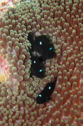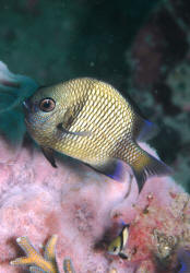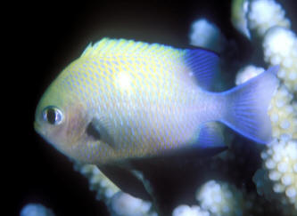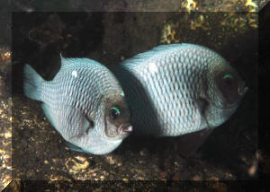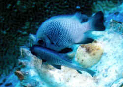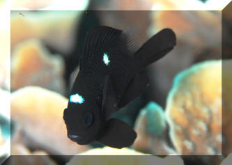 Frequent, small feedings of a variety of foods (dry, frozen, fresh, & live; both vegetable and animal) will help settle in the stock and reduce aggressive turmoil. Infectious and Parasitic Disease: Dascyllus are parasitized internally and externally by several species of Sporozoans, Cryptocaryon, Oodinium, roundworms, flukes tapeworms and crustaceans. For the most part they're disease resistant and coupling preventative measures with good environments generally results in good health. External infections can be excluded or treated by freshwater dips or lowered specific gravity. These damselfishes respond well to prophylactic copper treatments. Territoriality Territoriality can be a type of social disease. Keep your powers of observation sharp for extreme interactions and remove bullies. Inter-specific aggression is probably the single largest source of damselfish mortality, especially with Dascyllus, in particular that domineering domino, D. trimaculatus. Sex and the Single Dascyllus Dascyllus are substrate spawners ala Neotropical Central American cichlids. Pairs lay their several hundred sticky eggs on dead coral or other hard material they've cleared, where they are guarded VIGOROUSLY by the male until hatching, usually in three days. Difficulties in captive reproduction arise in getting sufficient food to the pelagic young.