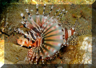 Selection: For the most part Lionfishes are easily captured (they don't swim quickly, are easily found in the wild), but they do take a beating in transit, holding, transit... on their way to your dealers. For girthy fishes with sizable appetites they are rather sensitive to ammonia poisoning and low oxygen concentration... Hence: 1) Don't buy newly arrived specimens... Let the poor fish rest up from being collected (all are wild-captured) for a few days to a week. Most all "anomalous losses" of these fishes occurs within a few days of collection and transport. 2). Don't purchase "spaced out" individuals. Healthy specimens are bright-eyed, alert, aware of your presence, not cowering in the corner or with cloudy eyes. 3) Avoid specimens with red markings or open sores. Torn fins are fine and will mend... they get broken in collection, being shipped in poor quality water, and the food-less interval of days to weeks before your shop's acquiring them... But look out for bad scrapes, and infected lateral lines. Look particularly at the fin insertion areas of the body for tears, evidence of bleeding. Most damaged individuals will heal, but it's best that they not be moved about when they are so impugned. 4) Hold off on purchasing fishes that don't eat at your dealers. This "old saw" is a valid yes/no decision maker for purchasing lions. A healthy lionfish will always show interest... at least awareness of potential food items in its vicinity. If one that you have your eye on won't take food in front of you, put it on "layaway" with a deposit and come back for it... feeding, at a later date. Systems: "Oh, they mainly just sit around, so we don't need to put the small Lionfishes in large tanks, provide that much filtration, aeration, circulation." Wrong. Though they are quite sedentary, dwarf Lionfishes are "messy" fishes in terms of foods, wastes... and good sized/weight in small packages as well. I like a friend, co WWM Crew member James Gasta's rule of thumb for marine stocking... of "One cubic inch of life per five gallons of water"... given this measure instead of length per so many gallons you can see that bulky lionfish species need room. I would not put one of these fishes in less than a forty gallon system. Filtration likewise needs to be upgraded, allowing for both the steady secretion of ammonia from the fish's gills and the periodic expulsion of solid and liquid wastes. Similarly, their water needs to be maintained in a highly oxygenated state, with vigorous circulation. Though not talked about often, likely vying with "gut blockage" from mis-feeding as a common cause of death, Lionfishes, being big eaters, mess-makers are often challenged by iatrogenic changes in their water chemistry... That is, they can and do modify the water they're in to at times, disastrous degrees. Alkalinity and pH in particular often slide with systems housing Lionfishes... Even given a decent volume of water, plenty of calcareous substrate and rock in their tank, without regular partial water changes, your aquarium can have a precipitous slide in buffering capacity... Do keep an eye on your pH and dKH. Lastly a stock mention of lighting and scorpaenid (mail-cheeked) fishes. They are susceptible to a blinding syndrome as a consequence of being placed in too-bright settings, lacking caves, overhangs to get out of the bright light. If you detect cloudiness on your lion's eyes, I'd check and rectify pH if this has slid, but next look to providing shade or moving this fish from an overlit tank. Do provide sufficient cover, caves, overhangs for your dwarf lion/s to hang out (upside down or right-side up). This is what they do in the wild during the day. Tankmates/Compatibility: There are two basic rules to matching livestock with dwarf lions... Nothing small enough to fit in their capacious mouths... and secondly, nothing that will harass them. The first category must need include motile invertebrates... small crabs, hermits, shrimps... all can be inhaled... and may be, as well as any fish small enough to fit. Note that we didn't mention slow or unaware fishes... eventually all fishes "sleep" or cruise about too-oblivious. Larger basses, eels, triggers, puffers, big angels and some other miscellaneous fishes may pick on your small lion... to its demise. Unlike the case with some of the Pterois species, dwarf lions rarely (but can) show intra-specific aggression, and are in fact, often encountered in loosely associated groups in the wild. More than one species, specimen may be housed in the same system, given adequate space, food... Foods/Feeding/Nutrition: Small lionfish species enjoy chunky, meaty foods, and in the wild this means live... In captivity, they can almost always be trained to accept cut meat, freeze-dried, frozen/defrosted items... but this may take some doing, including periods/bouts of starvation on their part. Be aware that these fishes can indeed go without food for a few to several weeks... and don't give in to the foolhardy practice of feeding them "freshwater feeders"... comet goldfish, livebearers, Rosies... are poor nutrition, expensive, inconvenient... and the hands-down number one killer of these fishes... from either fatty degeneration internally over time, or outright "gut blockage." If your lion is on an absolute, getting-too-thin starvation, a live glass, ghost shrimp will likely be very readily accepted. Otherwise, do devise a "feeding stick" (wood or plastic) that you can attach non-live food items to and practice waving these meaty foods (silversides, lancefish, shrimp... whole or pieces) offerings in front of your lions face... toward the evening (most are crepuscular to nocturnal ambush predators)... In time you will have a fine aqua-pet. How often should they be fed? Twice a week is about right... and never to satiation... You don't want to make the lion look or feel like a living balloon. Diseases: Though far more Lionfishes, small and large species, are killed from mis-feedin