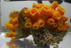 Sun Coral Help, fdg. 6/30/07 Hi guys! I just purchased my first Sun Coral. It seems very healthy with about 25 polyps on it. I have done my research and understand that I need to feed it every 2 or 3 days and that it does not need to be in strong light. I have placed it in the shadow of an overhang at the bottom of my tank. <I'd lean more towards every other day. But some people get away with feeding less often.> My only issue is that it only comes out to feed when the lights are off. Otherwise it stays tight inside. I have been feeding it in the night for now, but have heard that they can be switched over from their nocturnal habits. <Yes, they can be "trained" to expect food around a certain time.> Can you give me some advise on HOW to do this? <Just move the feeding time slowly towards lights-on hours. Feeding it every day for several days while it's in "training" might help the coral get used to the new routine faster. It might also simply switch on its own if you usually feed the tank during the day (especially if you feed around the same time every day).> Thanks! Keith <happy to help Sara M.> Re: coral advice... comp. f'? 3/21/07 Thanks Brandon, for the quick and detailed response. <No problem.> After reading your reply and researching further, I have come to the conclusion that this is not the right coral for me, or rather; I am not the right keeper for this coral. <Sorry to hear that. They can be quite rewarding.> But after more consideration, I think I would prefer to spend some time to try to get this animal healthy, and sell or trade it to another enthusiast who WILL make an appropriate keeper. <There are quite a few.> If I just it back to the LFS they will likely just throw it back in with their semi-cured Live rock. <Not uncommon.> Now, unless another person spots it AND recognizes it AND is willing to make the effort to properly maintain it, this would be basically like throwing it away. That just would not feel right. <Agreed.> Here is what I am considering: I have a 2.5 gallon HEX tank with UG filter and lights. I would like to set up a solitaire habitat for this coral, and spend the next few weeks giving the daily or bi-daily feedings it requires. I would like to use the 2.5 gallon for this, but will never find a skimmer that would fit. I do think that it would be easy enough to change 25 to 50 percent of the water two to three times weekly. For filtration, I would be using an air driven UG plate with a bio-pad from my existing filer placed underneath and cover it with crushed coral. I have small submersible 50w heater that will fit in the tank as well. This Sun Coral would be the only organism in this tank and it will be a temporary situation. <Hmmmm.> Does this sound like something that might work? <I think that it would be easier on you and the coral alike to try something a little different. Get a deep bowl and place the coral in it. When you want to feed it all you have to do is remove the bowl (water still inside), and feed it that way. The left over food can be discarded, and you can then place the bowl with the coral in it, back into the tank. This method was proposed to me when I was inquiring about keeping Tubastrea Micracantha. Brandon.> Green Tubastraea sp. Captive Care of Tubastraea micrantha 2/4/07 Hello All! <Greetings! Mich here.> Recently, after some extensive research I have decided to purchase a nice piece of Sun Coral. My hesitation was due to the fact that each polyp needed to be fed quite regularly. <Regular feeding is imperative.> I began shopping for a Sun Coral recently and came across a dark green one! I have never seen one or even heard of it in such a color. I purchased it after taking the advise of the LFS's manager that it was no different than the other Sun Corals. My question basically is, was he right? <Not so much. It is in the same genus, but the species is different. It sounds like you have Tubastraea micrantha. It could possibly be Tubastraea diaphana, but I will assume it is the former. More info here: http://www.wetwebmedia.com/dendrophylliidae.htm This coral has a notoriously poor survival record and requires a very fast current and large amounts of food. I do hope you have a great protein skimmer.> I have tried researching on the Internet and yes, WetWebMedia.com and was not able to find any one mention a Sun Coral of this color, although, there was a website with professional photography of reefs around the world showing a green Sun Coral similar to mines, but no mention of it otherwise. The coral came with some smaller YELLOW polyps beginning to grow around it. I will be feeding this coral at least three times a week or can I cut down on the feedings. <Should be fed daily.> I culture my own phytoplankton and add about one full plastic cup a day, 1/2 in the morning and 1/2 at night, can this substitute the feedings? <Malnutrition is the biggest challenge these corals face in captivity, daily targeted feedings with mysids, diced fish, and zooplankton soaked in Selcon would be most appropriate.> In addition, I have been getting conflicting information on where I can place the coral, in caves, dark areas, or in a lighted area? <Where it can be most easily fed without getting so much light that it get overgrown with algae.> I would have liked to place the coral higher up in my 24" tall 90 gallon tank where water flow is more abundant, only problem is, I'm afraid the 150w halides may burn the coral? <Shouldn't burn it. I'd be more concerned about water flow and feedings.> Just so you know, I have an LPS dominant tank, 90 gallons with a 50 gallons tank used as a refuge with Caulerpas and Chaetomorpha. Thank you for any advice you can provide. <Hope you're up for a challenge my friend! -Mich>