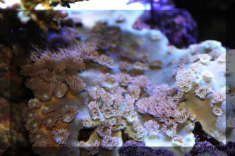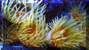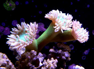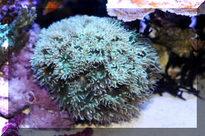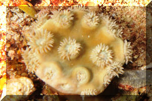 Dendrophylliidae: Characteristics of the Family: Most species lack Zooxanthellae. In fact this family contains the most common Azooxanthellates species found on reefs. They're either solitary or colonial, with corallites are mad up of walls that are porous, mainly filled with coenosteum in life, fused with distinct (Pourtales plan) septa. Of the genus with photosynthetic endosymbiotic algae, Turbinaria often finds its members employed in ornamental aquatics. As far as ahermatypic species of this family, only Tubastrea is regularly imported. Range: Dendrophylliids are found in tropical and non-tropical regions of the worlds oceans, some of the ahermatypic, Azooxanthellates ones to a depth of a 1,500 meters. The genera Turbinaria and Tubastrea are prominent shallow reef species in large parts of the tropical Indo-Pacific. Some Dendrophylliids are inconspicuous, but found in the tropical West Atlantic. Dendrophylliid Genera You're Not Likely To See: (There are others); Balanophyllia, Dendrophyllia, Not distinguishable from very similar Tubastrea without examination of dead skeletal (septal fusion) characteristics. Eguchipsammia: Mud dwelling, Azooxanthellates. Heteropsammia... Genus Balanophyllia: Solitary polyps, calyces appear round in cross section.
