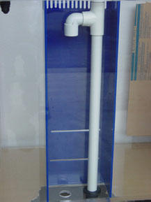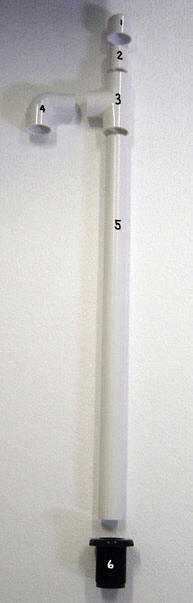 BUILDING THE STANDPIPESee photo below for reference. 1. Cut a small piece of PVC (#2) and attach the end cap (#1) to the section of pipe and glue the assembled section to the tee (#3). 2. Glue the street ell (#4) to the tee pointing the ell directly downward. 3. Cut the main pipe (#5) so that when inserted, both into the bulkhead (#6) and the tee, the mid section of the tee will be about 2” lower than the weir. 4. You can now glue the main pipe to the bottom of the tee. 5. Drill a small hole about 1/16” in the top of the end cap. This prevents a siphon from draining the overflow too fast. This hole may have to be enlarged. 6. Insert the completed standpipe into the bulkhead. If you are satisfied with the height, turn on your pump. Watch the water level in the overflow. If it maintains a steady height around the mid section of the tee, you are done. If the water level in the overflow drops too far, you will need to increase the size of the hole slightly. Make the hole larger in very small increments; say 1/16” at a time until the water level maintains its height at the mid section of the tee. You could also install a valve in the hole and control the water level by this means.
