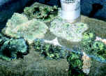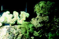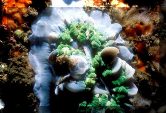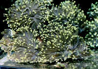 3) Lighting, full spectrum, low-to medium intensity... provided by VHO or compact fluorescents is fine. These are photosynthetic organisms, but remember, ones that live in turbid, muddy water often shielded by overlying sea grasses (Thalassia). No need for metal halides. 4) The need for organic nutrients: IMO, this coral should only be kept in a designated, "species" set-up, in very-well established, fine sand and "mud" substrate, sea grass, high nitrates (tens of ppm and up) are no problem and calcium, strontium... but still no discernible soluble phosphates. With this species you have to take care not to "over"skim, removing bio-useful minerals and trace elements. These essential materials can be replaced through feeding (see below), water changes, and live rock (and possibly sand) use.