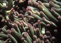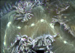 As a "content" provider (writing, photographs) in the ornamental aquatics interest (hobby, business, sciences) I'm faced with answering queries about "trouble organisms" on a constant basis... As a real "old timer" who's time in marine husbandry spans its modern advent (yep, back to Robert P.L. Straughan) to the present, I have seen trends, topics and fads come and go (e.g. both cycles of sugar as salt mix... remember Magic Ocean?). Incredulously, certain aspects of the trade have persisted... I would have never believed the insidious practice of cyanide poisoning would make it past the millennium, let alone spread from the Philippines to parts of Indonesia... And livestock... Folks are STILL buying/trying Moorish Idols (Zanclus canescens), Pinnatus Batfish (Platax pinnatus) and Ribbon Moray Eels (Rhinomuraena spp.)... though these (and other fish species used extensively) have dismal survival records; more than 99% dying within a few months of wild collection... And fishes aren't the only "ridiculous ongoing examples of poor choice"... Back in the fifties and sixties, what was the most popular genus of corals used in the hobby? Goniopora spp., aka Flower Pot Corals... and still in number two popularity (Green and Shirley, 1999)... and is still a very poor choice... yes, rating my worst of three rankings (a three) with more than half dying within three months of gathering off the reef. Which leads us to the topic of this essay, the third most commonly available Scleractinian species, Elegance Coral, Catalaphyllia jardinei. Though writers from Veron (1986) to Fatherree (1999) rate this species as "excellent" for aquarium use, more than half of them perish within a couple of months. My purpose here should be obvious: to make consumers aware of the odds they face in selecting this reef-building stony coral, and to increase the folks who decide to invest in this species chances of keeping theirs alive by providing natural history and husbandry information. To wit: this species does not live in sterile, nutrient-deprived settings... but in the wild in muddy, mucky areas semi-buried in the substrate... sometimes in the shallows of near shore, other times at the base of reef slopes at depths of 20 meters or more. Classification: The Family, Genera, Species of Aquarium Interest: The family (Caryophylliidae) that includes the Elegance Coral is one of extreme importance to marine reef hobbyists. Euphyllia species are the most common offered live corals in the trade. This genus includes Frogspawn Coral, E. divisa; Torch Coral, E. glabrescens; Grape, E. cristata, Hammer, E. ancora (among many other common names). And where would the hobby be without the bizarre-appearing but hardy Bubble Corals, genus Plerogyra? Or Fox Corals, Nemanzophyllia, or Eusmilia, or... there are others. But back to the topic du jour: There are some authors that identify more than one species of Elegance, but I will go with "the rest" who say the genus is monotypic, Catalaphyllia jardinei IS the Elegance Coral. Distribution/Size: Elegance Corals hail from many parts of the Indo-Pacific; northern Australia, up to southern Japan, stretching out west to the Seychelles. Most have come into the hobby from the Philippines, the Solomons and parts of Indonesia. Think you've seen some big Catalaphyllias? They approach two feet long in the wild. Selecting Specimens: Examine the prospective buy carefully for breakage and uniform coverage of its skeleton by living tissue. Live Elegance polyps can be a few to many millimeters deep (when expanded) and damaged in collection, shipping and further processing. There should be no tissue recession from the skeleton, or signs of bleaching. Know that there are two "distinct varieties" of this species... free-living phaceloid shaped colonies that are collected in shallow/er waters in mud/mucky circumstances, and deeper water large colonies (much like Goniopora stokesi) that pieces are rudely broken off from. These lighter colored, often smaller polyped pieces rarely live for any period of time, and should be avoided. A good deal of specimens this last year or so have been "worse" from the get go, compared with years past. If at all possible, you want to either trust your dealer totally to do their job of picking, acclimating and keeping their stock or take a look over a few days time yourself to assess the quality of the potential purchase. However, it is my not-so-guarded opinion that the majority of increased losses of these gorgeous animals is not so much due to poorer initial quality specimens as their placement in unsuitable circumstances. See below. Environmental Conditions: Unlike corals in general and Small Polyp Stonies in particular, Elegance (and other Caryophyllid) Corals require water of less than typical reef system quality. Yes, you read that right, this species is found lying level in/under muddy, shallows of grassy reef flats, with all that go with the setting; low-medium/diffuse light and high organic nutrient concentrations. Allow me to be more specific... you're soon to understand why these animals often suffer in aquarium settings.