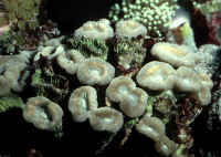 Candy Coral First, I have to say your web site is awesome. I wish they had tools like this 40 years ago. If I spend any more time on this site someone is going to expect an engagement ring. <Thank you for the kind words, but I am already taken.> I recently bought what I was told was a LPS known as a Candy Coral. After I got it home I noticed one of the polyps didn't seem to fully inflate and upon closer inspection, it looks like a very small fan-shaped transparent feeler is feeding from inside this polyp. Is this part of the Candy Coral or did he just hitch a ride and is an unwelcome guest? <From your description, it does not sound like a part of the coral.> Will he cause trouble? <Hard to say, this could be some sort of mutual relationship. Likely not parasitic in nature. At worst, the creature is exploiting the coral and may in time damage this one head.> Should I kick him out for not paying his rent? <I would leave it alone for now.> Keep up the excellent work. <We will. -Steven Pro> Re: Candy Coral I probably should have given you a more detailed description about this little guy. <A picture would be nice.> He as approximately 5 almost invisible "fingers", 3/16" long, that comes out of a tiny hole from this one polyp. The hole is off to the side so I know it is not a natural orifice, although this hole looks "healed" and has somewhat of a ridge around the opening, like it's been in existence for awhile. This tiny "hand" pops up out of his hole and twirls around gathering food and then pops back into it's hole and does this repeatedly, usually in the evening. My main concern is whether this thing will multiply and cause trouble with either another polyp or spread to another coral. <Both of these are possible.> All of this is going on in a 5 gallon nano reef that has been set up for two years, although the coral have been recent additions, which includes a hammer coral, another unidentified LPS, a tree coral (placed as far away from the LPS as it could get), assorted button polyps, both a red and a blue hermit crab, two peppermint shrimp, a tube anemone, a lime green feather duster and is packed with as much live rock and live sand as I could cram into this 5 gallon, maintained by a 6 watt blue PC and a 27 watt 6700K Ultra-Daylight Linear Quad turned on by a timer for 10 hours a day, water temperature runs around 78 degrees at night and goes up to 80 degrees during the day due to the PC lighting. I have a Whisper 5-15 filter hanging on the back which gets changed every couple weeks. A lot of work has gone into maintaining this reef tank and I would hate to see this little kingdom destroyed by an unwelcome predator. <This is likely a commensal relationship.> Can I include another question while I'm at this? <Sure> I originally inherited this set-up from my daughter who lost interest and it was overwhelmed with Aiptasia, which was the reason for the two peppermint shrimp. Now that the Aiptasia are all gone, what do I feed the peppermint shrimp? <They will eat just about anything.> Since they devoured about 30 small Aiptasia I have been feeding them and the tube anemone small chopped up pieces of a frozen food called "Angel Formula" manufactured by Ocean Nutrition. Oddly enough, it has turned the peppermint shrimp a dark orange. I have been feeding the coral "Micro Vert" manufactured by Kent. <Please check the ingredients and see if anything listed is truly needed.> All of the rock now has purple coralline algae growing on it, with numerous red and green macro algae growing everywhere, including a healthy piece of Halimeda growing so fast I have to harvest it regularly. <A very good sign> I also harvested most of the bubble Caulerpa, it looked so healthy I was afraid it would go asexual. I make weekly water changes of 1 gallon to maintain the water balance. Any advice or changes you could offer regarding this setup would be greatly appreciated. <Everything sounds fine to me.> I certainly appreciate your opinion and any more information you could give me, or direct me to, would be greatly appreciated. Thank you very much. <It seems like you are ok, if not a bit crowded. Now that you are successful, maybe think about a larger set up. -Steven Pro> Feeding brain coral I am considering purchasing a brain coral and was interested in what is best to feed this type of coral. <Hmmm... that depends on what type of Brain coral. Some closed Goniastrea brain corals need high light and no target feeding whatsoever (they are nearly autotrophic). Open brain corals (Trachyphyllia) however are fairly low light and require very regular feedings (minimum 3-5 times weekly). > I have read that it should be feed shredded pieces of shrimp and another source suggested zooplankton. What would you recommend, shrimp from local grocery cut up or zooplankton from fish store? <a mixed and very finely minced variety of all/many: krill, cocktail shrimp (raw shell on), mysids, Pacifica plankton, Gammarus, etc> Also, I have read daily or weekly feedings? <depends on light... very small almost daily feedings for best growth and health> How would you feed the coral, just squirt the food on top of the open areas? Thank you, Abby <make a slurry of food in saltwater... put a tiny bit in 15 minutes before feeding to get polyps open.. then gently baste food with a tube, pipette or turkey baster in the general direction of the animals but never blasting right on top (frightens polyps in). Best regards, Anthony> Cladacora- Solitary Cup Corals (Gulf Rock) hello how are you doing today <very well with thanks and hope that you are the same> I found two Cladacora on my live rock I cant find any info I really only need to know if they can sting coral <they are only weakly aggressive and more likely to suffer in combat with most corals in the trade> I added a new leather coral and I noticed the Cladacora sweeping real close to my leather so please let me know if I should move it some where else <the sweepers are out in defense.. not to a