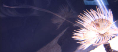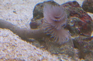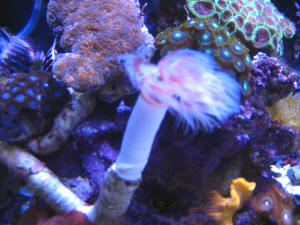 Coco Worm with "heads" that change color! - 1/22/07 Hi Bob, <Rick> I have done extensive reading about coco worms and haven't seen anything like what we have. It is about 1/2'" diameter tune 6 or 7" long. When it is out fully, which is most of the time, the heads (2 of them) change color!. <Neat> One will be bright pink and the other fairly yellow then after about 5-10 seconds, the heads swap colors like an old fiber optic toy!. <Oh... they're (two heads are better than one)... just switching position... quickly> At first we thought is was our lights playing tricks or some other explanation but we have eliminated all the variables and the heads actually change color over & over! We used our digital video camera and got very clear pictures of it turning colors. It shed it's "heads" a month or so ago and shortly after the new heads started to come out, they started trading colors again. Is this a rare event or is it just not documented often? <The latter> It very much happens right before your eyes every time it come out. I would be glad to send photos or video if you're interested. <I would like to see your efforts here.> Thanks! Rick Oppermann <Thank you. Bob Fenner> Feather Duster beh. - 12/12/06 <Hey Candace, JustinN with you today> I recently put a feather duster into a 10 gallon reef tank. Bear with me, as I am a newbie here. Today, my blenny was sitting with his head in the middle of the feather duster. From time to time the feather duster was emitting a brown colored smoke (or gas?). I shooed the blenny away and the feather duster sent up his "smoke signal" again and the blenny rushed right back and put his head once again into the middle of the feather duster. What is this stuff and can you give me a clue as to what is happening here? thanks <Sounds like you're witnessing a reproductive event for the feather duster, Candace! My guess is that its attempting to spawn, and the blenny is eagerly munching up the provided goodies! Nothing to worry about here, just enjoy! -JustinN> Re: Feather Duster beh. 12/14/06 Thank you for responding to my question about my feather duster. If he/she is "spawning" what needs to be done (or not) to bring new ones into the tank. I have not been able to find much about breeding them. Thanks Candy <Please read here: http://www.wetwebmedia.com/featherbehfaqs.htm and the linked files at top. Bob Fenner> Feather Duster Partially Out of Tube 10/1/06 Howdy everyone! <Living It Up> Found a FAQ http://www.wetwebmedia.com/featherfaq2.htm on that page sent by Wendy Milonas that partially answers my question. I do so love this site! <Okay...> I have a large feather duster (about 2") that hitchhiked on my LR. I'm still cycling my tank (there was a very tiny ammonia [.2 mg/L] spike the first day but ammonia, nitrites, nitrates were 0 as of yesterday) and planned a soft cycle to help him make it through. <?> Yesterday I noticed some very strange behavior. He stretched out of his tube and kept reaching towards water flow. At most he was about an inch extended past the opening. So I moved him and he continued to stretch. I made an emergency run to my LFS to get anything with phytoplankton in it (I was planning on ordering DT's live phyto over the weekend for the little guy) and DT's was actually what they carried! So I dosed him according to their recommendations, even using a tiny pipette to shoot some directly around his mouth and right upstream. Still he kept reaching. I moved his rock again (it's pretty tiny) and changed my water jet spout or whatever it's called so that he was in an area of more flow but not so much that his crown was plastered against the rock. His tentacles/radioles are curling (I think they may have been curled when he was first in the tank) and now he is no longer reaching out of his tube, but has sagged back down and seems to be too large to fit through the tube opening. He (I don't know the exact sex, but he was named "Buddy" and it stuck) has never fully retracted, which worried me, but the latest symptoms lead me to believe he is sick or dying. <Mmm, no... not likely> Is there anything I can do for him? If it seems as though he wants out is there any way to help him? My tests are still all very good (or at least, that's what they tell me), and I have very tiny miniature feather dusters that appear to be fine in my tank. I just went down to check on him and he is reaching again, his crown not fully extended and still curling. Thanks for any help you can give, Meghan P.S.: I was a little disturbed to read through your feather duster page where you list food recommendations: Daily to a few times weekly offering of live (brine shrimp nauplii, rotifers...) or prepared foods (store bought or home-made) is recommended. Clam "juice", other "meaty" foods frappe'ed in a blender or smooshed with spoons or other tools applied in the general area (with a syringe, turkey baster device...) with most all particulate filtration switched off for the duration (@ an hour?). Your feather duster FAQs are all correct when they say that these worms are filter feeders and specifically planktivores at that. Most of the recommended foods do very little for them (clam "juice" should include phytoplankton, but it may be oyster eggs, I'm not sure) and unless they have phytoplankton in the water as a side addition, won't help. Just letting you know that the front page may need some editing. <Mmm... there are many such species of tubiculous Polychaete tubeworms... take different foodstuffs... I would not be overly concerned with the "leaning" behavior of yours... it is likely regenerating a capitulum/head... and will "toss" the current one. Bob Fenner> Featherduster Worm Left Its Home - 07/26/06 Hello! <<Howdy!>> Love your site, thank you! <<Quite welcome>> I have read through your facts and could not quite find the answer I am looking for...my feather duster came out of his tube and lost his crown, which I understand can happen...my question is, he is vulnerable. I put 