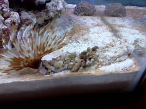 Feather Duster Color Oscillation Bob, I recently purchased a feather duster via mail order. It arrived without a crown but seems to be regrowing it nicely - it is about 3/4" long now after about 2 weeks. It was collected somewhere off Florida. It looks as if the worm might be splitting into 2 worms within the same tube. I see two separate cones. What I wanted to ask you about is a strange color oscillation in the worm(s). It is very subtle but the color changes from lighter brown to a darker brown and then back. The period of the oscillation is about 5 seconds. The two sides or two worms seem to oscillate opposite of each other. While one is light the other is dark and then the swap. Like I said it is very subtle but definitely happening. I can't attribute this to any fluctuations in lighting and even that wouldn't explain why half of the worm changes and then the other half. It seems to do this all the time. I noticed it about 2 days ago. I just wonder if you have seen this before or if it is unusual. It is very curious either way. God must have a sense of humor. Kenneth <Indeed. Yes, have observed... a normal behavior. You have keen observation skills. Bob Fenner> Feather dusters, hitchhiker id, bubble spewing powerhead One of the Shaving Brushes that I got in a mail order Thursday has a clump/blob/coil of yellow/orangish stuff that looks like a string of pearls. It is hard to the touch and is imbedded at the base of the green, right above the calcareous tube. The "pearls" are about 2-3 mm in diameter with an equal sized space between each and the next one and the "pearls" are held together with a strand of the same color. Do you have any idea what this might be? I have no digital camera or I would send a photo. <Could be a sex product or colonial invertebrate species of some sort...> Please advise about placement of feather dusters. I put them in the tank and this a.m. they are all laying down, rather than standing up, but are all open. One spewed out a bunch of cloudy puffs this morning. It didn't leave any mucus trails, just cloudy puffs, 6 or 7 of them. Does this signal trouble? <Not necessarily... but do take a look at the images on WetWebMedia.com re these Polychaete worms... http://www.WetWebMedia.com/feather.htm should not be just laid on the bottom of your tank> Finally, billions of bitty bubbles are shooting out of my fully submerged, 1 week old, AquaClear 402 powerhead. It is located in the back right corner of my 46 gal bow front, below and slightly to the right of my SeaClone protein skimmer. In the back left I have an AquaClear 300 hang on filter. I turned off the protein skimmer and the powerhead is still shooting out tiny air bubbles is spurts, about every 10 seconds. I have no coral - unless it is slowly developing on the LR, but I haven't seen any yet. Do I need to stop this bubble shooting? If so, how do you suggest? <Please use the search feature... on the bottom of the homepage of WWM: http://www.WetWebMedia.com/ inputting your search terms... and read through the many FAQs re "tiny bubbles" and your gear. Bob Fenner> TIA for your help. Jeanne Feather duster splitting? 5/27/04 I need info on reproduction on feather dusters ? don't know if they are splitting. had them for two weeks first ones I have had. <we commonly get queries about new feather dusters losing their "heads"/feathers and mistaken for reproduction. If so, this is stress, and it may grow back in weeks time. Otherwise, do browse our FAQs on this subject (go to www.WetWebMedia.com and type in "Featherduster" in the search field of the Google tool on that page... many links to follow). For specific reproduction info, look for the published works of Ron Shimek online... we has written much on Polychaetes. We also cover this group in detail in our new book "Reef Invertebrates". But do begin simply by browsing our archives. Best regards, Anthony> |