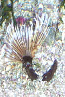 consumed... you will know... Bob Fenner> Fish Show Hello there Bob, Question: Do you know of a marine fish/reef show in the Chicago Area? <Am sure there is at least a "tank tour" type of one... have you contacted the local society? URL is on the Links pages on www.WetWebMedia.com> Question: Growing from my live rock, several critters with a tan center tube with several upward pointed filaments at the top end. Whole thing is about 3/8-1/2 inch long. Any idea what it is? <Sedentariate polychaete annelid worms... types of feather dusters... see the above site for pix, more> Question: 72 gal reef, 70 pounds live rock, trickle filter and protein skimmer. Water quality excellent. Current stocking: 4 False Percula Clowns (Amphiprion ocellaris), 1 Lunare Wrasse (Thalassoma lunare), 1 Sailfin Tang (Zebrasoma veliferum), 1 Lawnmower Blenny (Salarias fasciatus), 1 Royal Gramma (Gramma loreto), 1 Rainford's Goby (Amblygobius rainfordi), an assortment of hermit crabs, turbo snails and 2 Tonga Abalone (Haliotis sp.). I would like to add one bright blue fish and a couple of cleaner shrimp. Think I can do it? If so, any recommendations? <See the WWM site... about the Cleaners, Fish Selection, and that Abalone...> Comment: A reader recommends Chicagoland LFS, Living Seas and The Sea Shell, two very good shops. Would also recommend Scott's in Westchester, Illinois, less of a selection, but good hearty stock. <Okay, thanks for this... will post for others use.> Love your web site, and keep up the good work. <Thank you my friend. Bob Fenner> Regards, Frank Canzolino FD Featherduster Worm Update Bob--thanks for your past responses and insights. I just purchased a copy of your book, "The Conscientious Marine Aquarist," on eBay. <What? Sniff, someone's giving up their copy!?> I can't wait to get it and read it from cover to cover. <Am sure you'll enjoy, benefit from the experience> (I noted from comments about your book on WWM that all the retailers are out of stock, and I also found that to be true. eBay is always the first place I look for hard-to-find items.) If anyone else inquires, let them know that they can buy your book on the web at http://www.bestfish.com <http://www.bestfish.com> , or on eBay (listings posted by this seller), while supplies last. They only had two of the books up for auction this morning, and I've already snapped up one of them! <Will post this, thanks> On the Featherduster--last night when I got home from work, he was partially retracted into his new tube. Seems that he has already regenerated about 1/2" of it--so he's going to be fine. Tough little devil. <Yes, amazing animals... you will see I've had many interesting personal experiences with polychaetes...> One other note--we put in 3 small horseshoe crabs on Sunday to help stir up the sand and eliminate some of the detritus at the bottom of the tank. Two were doing fine and emerged last night during the tank feeding. I found the third on his back near the back of the tank, in acute distress--his legs were moving much like those of an insect that had received a spray of insecticide--retracting and extending very slowly. He was unable of self-mobilization. I removed him into a glass of tank water for examination. He had a white fungus-looking growth under the front part of his shell, that I could see through the shell. The white growth was only on the front part of his underside, in the "head" area-- and not all over his underside. This obviously was some kind of disease or fungus. (He ultimately died, and I froze his remains for examination by the LFS.) Any ideas what this might have been? <The motion is natural, and do agree with your appraisal of the disease... the balance shifted to death for this specimen... BTW, not great "stirrers", "cleaner uppers" for tropical marine systems... Read over the Sand Stirrers section of the WWM site here.> P.S. I just finished reading the article and Q/A column on quarantine. The crabs were not quarantined. New livestock will be in the future, as ignorance is no longer a viable explanation. . . <Ahh, very good to read of your commitments to improvement.> Thanks much for your responses. Once I get your book (by priority shipping, I might add), there should be fewer issues that I can't resolve on my own! <Next time their stocks dip, am going long on FedEx and UPS! Bob Fenner> James A. Deets Discarded Feathers Hi Bob: This is a "5th deep breath note" ... referring to your "10 breath" advice when faced with a perplexing marine event. Two days ago we bought three Giant Feather Duster Worms (Sabellastarte magnifica?) for our 8 week old LR/LS 40g system. All seemed to go well until this morning. While admiring the intermittent feathery displays, we were shocked when during one worm's extension of feathers they [the "feathers"] simply dropped off the end of the tube and drifted away in the current! The feather "crown" was intact attached to a whitish ring at the base. Assuming the discarded feathers were not a good addition to the environment, I fished them out of the tank. Now I am not sure what's going on. Are you familiar with this worm behavior? The inhabitant is in the tube [featherless?]. Is it dying? I'm anxious about leaving a declining specimen in a small tank. Thanks in advance for your insight - Tom Stecik <Am indeed familiar with this "loosing their head" behavior of tubiculous Sedentariate polychaete worms as this... strange as it may seem, this is a "natural" behavior... Don't remove the seemingly empty "worm tube" and stand by to be impressed, as this organism will likely be re-emerging in a few days to weeks with a need crown of feeding "feathers"... Be chatting my friend. Bob Fenner> Featherduster Worm Question I added a Featherduster worm to my 115 gallon reef a few weeks ago--he was one of our first livestock purchases for a new aquarium. He was perfectly happy and always visible from the time we put him in. This weekend, I upgraded to VHO lighting, and he disappeared. I surmised 