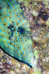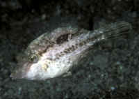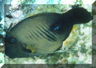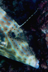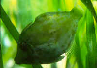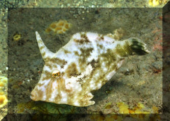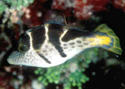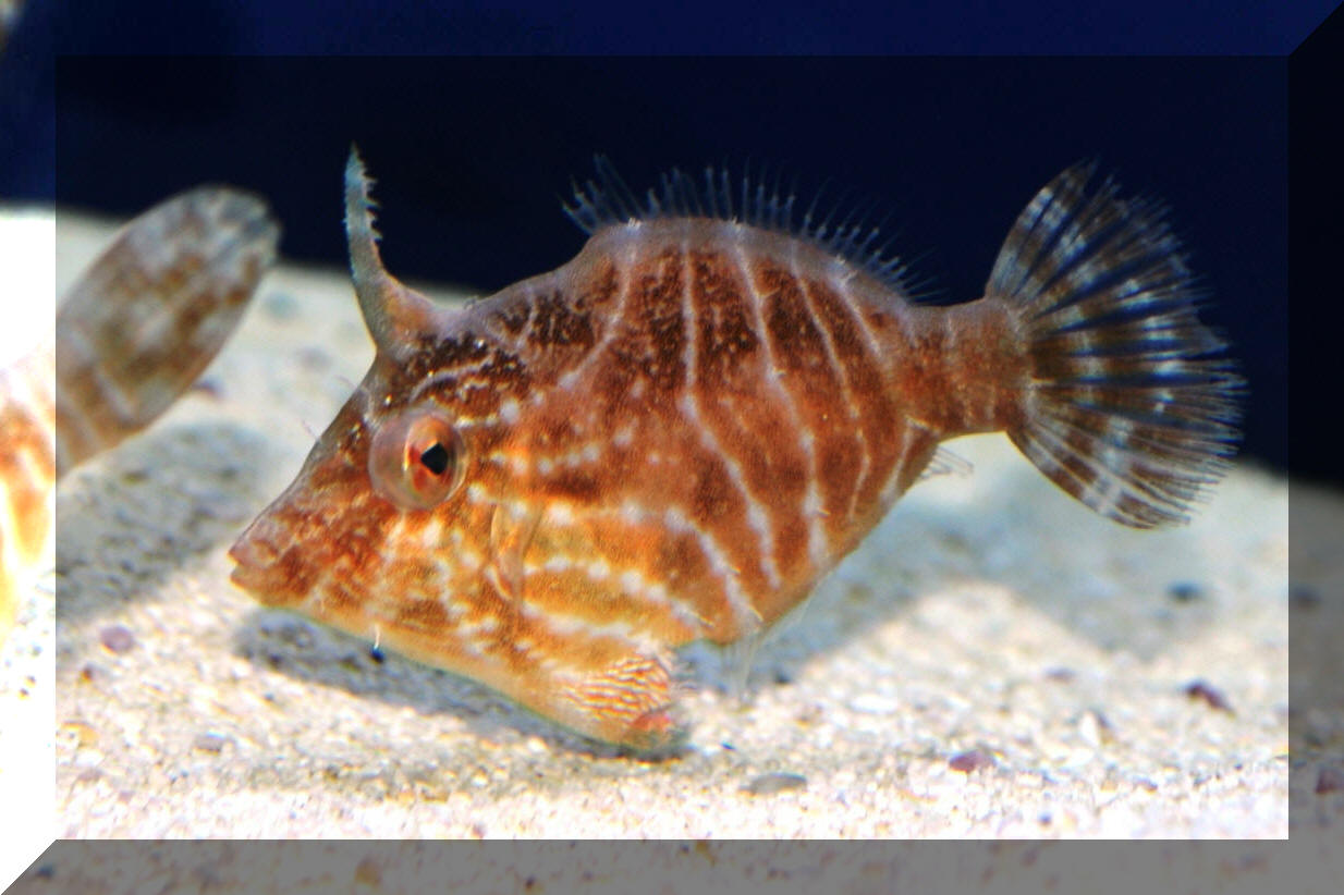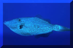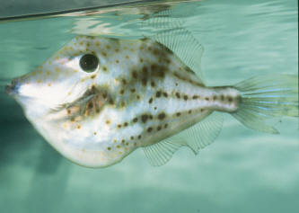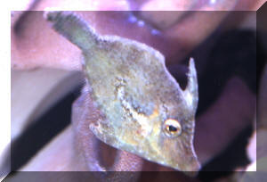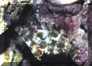 In many ways just as appealing in color, pattern and behavior as their toothier cousins the Triggerfishes, filefishes are more suitable tankmates on the basis of better-temperedness. Where any given trigger would rather "bite than flight", Files would rather "high-fin" it off to hiding. Given adherence to a few selection and maintenance criteria, the novice can experience success in keeping many members of this group of fishes. Classification: Taxonomy, Relation With Other Groups Nelson used to place the filefish in a subfamily, the Monacanthinae (= "one spine") sharing the family Balistidae with the Triggerfishes, subfamily Balistinae. Note the convention in zoological nomenclature (scientific naming) of designating families with an -idae ending and subfamilies with -inae. Simple stuff, yes? But, no there are some kill-joy old and current timers (I'm one of them) who "elevate" the filefishes to their own family level, the Monacanthidae. No sweat. These bad boyz find themselves in turn cataloged in the "most advanced" Order of living fishes, the Tetraodontiformes, along with such characters as the various puffer families. Who Cares About This Scientific Naming Anyway?: "News Flash": We break here for an important side note here concerning any and all references to these fancy scientific names, and higher classifications. I want to tell, maybe the word is show you the value in bringing up family, order, species et al. naming at all. First, there is the matter of "common symbolism", that is, language itself. When you read or hear Yellow-tailed blue tang what comes to mind? Do you think this is the same for everybody who might read this book? It is indeed not. As the "Aquatics Buyer" for the mass-merchandiser PetCo this point was made to me in trying to assign one "name" for every SKU (stock keeping unit number) that in turn referenced a given type of product (or livestock) for "inventory control". Our stores on the eastern seaboard would call me desperately seeking the "hippo tang" or "palette-surgeon" SKU. What we're these fishes? Yes, the same species Paracanthurus hepatus, by other common names. Unfortunately, the computer types in "MIS" (management information services) wouldn't help; "There's only so many SKU's available, and only so many characters/letters per SKU...". Ho-boy; I think this matter was resolved (not solved) by "fudging" the common name with an analog device (marking pen) on the livestock's label. My second point in bringing up the value of scientific naming has to do with "higher" classifications like family-this, suborder-that. I figure that I'm like you and most everyone else; I have an interest in pet-fish and willingly dedicate some portion of my consciousness to their appreciation; but we also have many other items clogging up our "read-only-memories" (biological ROM's). The higher classification schemes of taxonomy help us to store information on a vast number of organisms in a more concise manner. For this family, the filefishes, you know that they're closely related to the triggers; and that both families are not too distant from the families of puffers. What does this all mean? Well, sure they have structural, possibly evolutionary kinship with one another; but more useful to us as aquarists, their close taxonomic affiliation has practical implications. Files, triggers and puffers all get around by the same sort of undulation of their dorsal and anal fins; they eat about the same meaty foods in approximately equal proportions and intervals. Guess what? All of them suffer from similar maladies and infections, and are treatable in likewise fashion. Their environmental demands, reproduction, intelligence/behavior, the fact that they all will bite you... are also comparable. Memorizing and using this information for each individual animal would be hard compared with knowing it "by higher category". This is the practical value of "higher classification". Use it if you see worth in it personally, otherwise don't let it bother you. Back to Classification of the Filefishes: Filefishes themselves are identified by having usually two dorsal spines- the second may be small or absent. Their soft dorsal, anal and pectoral fin ray spines are unbranched. They have small scales not arranged in regular series. Their bodies are prickly to furry to the touch (hence the name natch). Upper jaw usually with six teeth in outer and four in the inner series. About 31 genera including Aluterus (=Alutera), Amanses, Cantherhines, Chaetoderma, Monacanthus, Oxymonacanthus, Paraluteres, Pervagor, with about 103 species. Species of Use/Disuse By Aquarists: Genus Acreichthys: Four species. Hold out promise as great pest Anemone eaters... but will they stop there and not eat other stinging-celled livestock? Hmm.