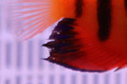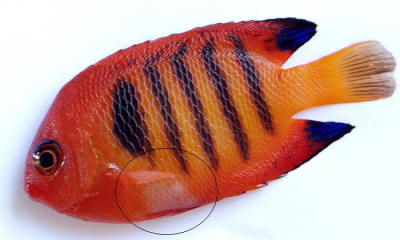 Flame Angel with Damaged Fins Mystery 10/27/07 Greetings, <Salutations> I recently purchased a flame angelfish from an on-line retailer that I had good luck with before. However, the fish arrived with pectoral fins about half the size they should be for this sized fish (about 3.5" long). <Interesting... genetic? Damage?> The fins also have a very slight black line at their edge. <Mmm, some of this can be natural... Centropyge loricula do have some black edging in some "races"... geographic difference...> I thought at first this could be formalin burn as I have seen this with flame angels exposed to formalin. <Mmm, possibly> I called the retailer and they assured me that formalin is not used on any fish. I have no reason to doubt them as they have been very straightforward in the past. They also stated that the fish looked fine when it left their facility. I next thought ammonia burn, but after checking the water in the shipping bag it had very little ammonia (about .25 ppm, pH 7.6). <And the shortened pecs would not occur to be burnt back this much, this quickly... without the demise of the animal assuredly> The fins are relatively smooth at the edge, just really short. <Again... perhaps a heritable characteristic. Happens> I am thinking the fish arrived at the retailer in this condition and they just didn't notice. <Likely so> In any event, the fish is acclimating well, eating on the second day in quarantine. However, I am concerned about possible ammonia exposure previously that could lead to this fish declining later on. <Such damage should be adjusted for within weeks... Like ourselves, fishes regenerate blood cells quite regularly, quickly... Other ancillary challenges are made up for about as rapidly> Given the effort and time required for quarantining a fish, I don't want to start with a fish that is doomed down the road. What are your thoughts? Will the fins ever grow back to normal size. <Mmm, not if genetically determined, no> What should I lookout for? <General health, good behavior... I would not be overly concerned, and don't consider this specimen "doomed", if as you state it appears to be acclimating well... I would just "chalk up" the small paired fins and enjoy this fish> Thanks Much, Greg <Welcome. Bob Fenner> Flame Angel Scratching... English??? 9/1/07