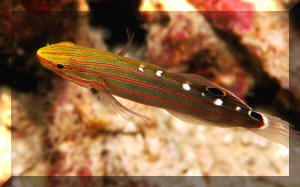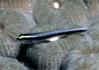 Gobies are the largest group of marine fishes, and fresh, brackish and salt combined; and the dominant element in small-fish bottom fauna on tropical reefs. Laugh if you will at the comical, shy gobies; it is they that will have the last chuckle. Yes, someday (soon) you will plunk down your hard earned cash to buy them. Most species live in, on, or near the bottom and are of small size. One super goby species attains a gargantuan eighteen inches, but almost all his kin are less than four inches in total length. The family contains the world's smallest fishes and vertebrate. Trimmatom nanus of the Indian Ocean females reach a mere 8-10 mm. There are other goby species only slightly larger. Many of the gobies live in close association with invertebrates such as sponges, shrimps and sea urchins; regardless of goby size, they become the center pieces of an aquarium when maintained with them. Diversity/Classification: Take ten big breaths Dear Reader; if the sheer diversity and size of such families as the Butterflyfishes, Cichlids or Damsels was impressive, "you ain't seen nothing yet". In recent times the Suborder Gobioidei has been divided into as many as six separate families. "Clarity is pleasurable", and for simplicity's sake we will stick with the historical two, the freshwater loach gobies, family Rhyacichthyidae of the Indo-Australian archipelago, & the humungous family Gobiidae. Alternatively you may find numerous families and subfamilies of "true" and fancifully named gobies in the literature and real life; the Odontobutidae, the sleeper gobies, family Eleotridae, sand fishes or sand gobies, family Kraemeridae, the obscure Xeristhmidae, worm- or Dartfishes, family Microdesmidae, and the family Schindleriidae. You'll forgive me if we don't list all the subfamilies. All told the gobies number some 267 genera and 2,100 described species with many more to come. All but about 200 are marine; mostly tropical and subtropical reef. We will definitely be highlighting just the most common and available types of interest to marine aquarists here, but I trust the above gives you pause to consider just how vast your possibilities are. What's A Goby?: The gobies are grouped together on the basis of several hard to discern characters; bones of the head, a family-unique sperm gland... but let me simply state some of the traits that are of use to us as identifiers and keepers of marine life. Most live in or on the bottom and are aptly adapted for a demersal existence. They are roughly torpedo-cylindrically shaped, and have reduced lateral line systems coupled with enhanced vision. Generally gobies lack swim-bladders and display degrees of fusion of their pelvic fins that are located anteriorly under their pectorals and used as a sort of suction disc to help them stay in place. In case you're asked, gobies can be readily distinguished from the numerous fellow bottom-dwelling blennies on the basis of dorsal finnage. Most gobies have two distinct top fins; Blennioids have a single long one. Selection: General Because of their diminutive stature and bottom orientation you have to look closely at these animals before purchasing. They really come in two qualities; sterlingly fit, and dismally doomed. Examine the stock carefully for bloody or white markings; tanks with bloodied or dead individuals should be passed on. Check their breathing, it should be regular and not labored; for most species kept 60-90 gill beats per minute. Is the fish looking around, aware of it's environment and you? Gobies are heavily predated on; they are never "asleep at the wheel". If the specimens aren't alert, leave them. Behavior: Territoriality can be a big problem with some species, individuals. Make and use clear, seal-able containers if you don't have extra tank space to move bullies, bullied. Predator/prey relations; oh yes, except for the species that have natural bad-tasting slime immunity (a term I just made up), like the coral, clown gobies, this group is like bite-size candy bars. Triggers, large angels, basses... most anything with a big enough mouth will suck them down. Acclimation; maybe just a general note to place all the "colony" type species individuals all at once to reduce the likelihood and intensity of aggression. Disease: Gobioids for the most part are relatively disease resistant, with the exception of one type of disease, environmental. Though they have cycloid or ctenoid scales, they have about the same intolerance of harsh chemical treatments as "naked" fishes. Many more are bumped off from copper, malachite and formalin- containing medicants than from the infectious diseases they're used against. Key Species, Groups: Genus Brachygobius: