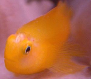 | Yellow clown goby with bacterial lesion?...tumor?...