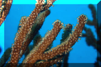 in size. Light brown to golden thick rods and polyps. Fan-shaped colonies. Roatan 2016 |