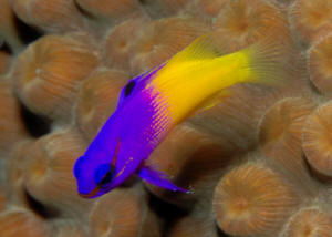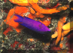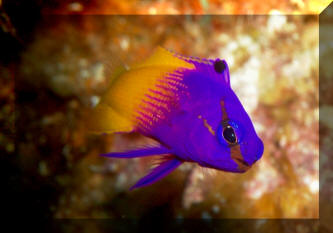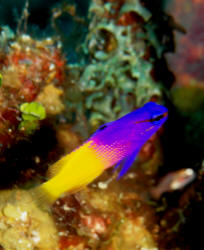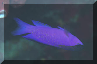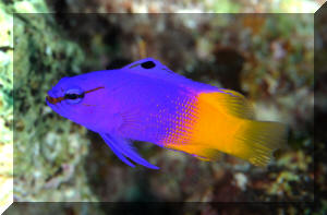 "Is there something wrong with that fish?" It's either upside down in that cave, or swimming at a forty-five degree angle when it's out". Arrgghhh, I used to hate answering those questions during all my years "on the floor" in pet-fish retail. On the other hand, maybe the people who didn't ask figured our livestock was whacked-out. At any angle, the "little basses" or Basslets of the family Grammatidae make delightfully peaceful and beautiful marine aquarium additions. "The" fairy Basslet, aka royal Gramma, Gramma loreto is a real standard in the United States, and one of the earliest commercially tank-bred and reared marines. Classification: The Grammatidae (formerly Grammidae) are all marine and confined to the tropical western Atlantic from the Bahamas to Venezuela. Do you like to avoid confusion? Me too; the common name Basslet is applied to four genera in three different families ; I would prefer to label the Grammatids as... Grammas! Now doesn't that make sense? We'll call them Grammas. The two genera and ten species (three for Gramma, and seven Lipogramma) are closely related to Dottybacks, family Pseudochromidae and Marine Bettas or Roundheads, family Plesiopsidae, as well as the true Basses of their namesake, Serranidae. The Grammas have the beauty and grace of all three, but thank goodness the generally peaceful of the Plesiopsids. Grammatids differ from the true Basses (family Serranidae) in having an interrupted or missing lateral line and a continuous dorsal fin without prominent notches in the membranes between the spines. Size? There are accounts of some "breeder" grammas approaching a gargantuan six inches, the biggest I've encountered on or off the reef were four. Good Species: Actually the whole family make carte blanche great aquarium specimens. However most are too deep water and less colorful than the top two mentioned here to warrant collection.