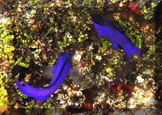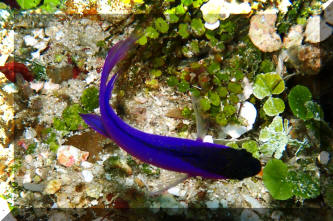 Freshly imported caught specimens way too often suffer from post-decompression stress... and something else; the ill-effects of chemical tranquilizing. Florida outlaws the use of Quinaldine and MS-222 (tricaine) but their use in other capture areas of the Caribbean is pervasive. Though not the scourge of cyanide use, there is decidedly higher mortalities associated with true anesthetic versus 'pure' hand netting. How to tell which type of capture technique has been used? You can't; just wait for a week or two. Trust me. Environmental Conditions: Habitat: Grammas live close by their nooks and crannies, upside down, right side up, at all angles. They prefer as much decor, broken up environment as possible, as well as low illumination. These fishes make great additions for reef tanks, staying small, not bothering invertebrates, and keeping deviant live rock critters, like benthic crustaceans and worms in population check. Chemical/Physical: Grammatids make great bioassay organisms for an individual system or store on mixed tank recirculation. Talk about "a canary in a cave"; their color and behavior fades with diminishing water quality. Water changing, reducing organic loads, re-elevating pH can be physically correlated with their observable health. Behavior: Territoriality in these species dictates that they be safely kept one to a tank... unless you can buy 'known pairs', or have a five or six foot plus wide system. Each individual needs about a half yard of bottom. If you intend to try your luck with more than one to a tank, by all means place them all at once. Reproduction: Males build nests from algae and plant scraps; both parents guard the gray eggs, numbering up to four hundred. The Royal Gramma was one of the earliest tank raised species back in the 1960's. Gramma loreto is unfortunately still wild caught in commercial quantities to satisfy demand. Foods & Feeding Grammas are very fond of brine shrimp, particularly live, but readily accept all foods on training. Disease The only one I want to mention is environmental; jumping. The grammas are aquatic Houdinis; keep their aquarium tops completely covered. Fini: Outside of the "bad news" of anesthetic use, the grammas are exemplary marine aquarium fishes. Want to save some time, snickering and explanation time? Paste a photo and statement on your tank describing their weird spatial orientation ways. Bibliography/Further Reading: Hemdal, Jay. 1985. Caribbean Basslets. TFH 12/85. Nelson, Joseph S. 1994. Fishes of the World, 3rd ed. John Wiley & Sons, Inc. NY. Ott, Gerhard. Undated. Gramma loreto from a snorkelers viewpoint. Aquarium Digest International #34. Randall, John E. 1968. Caribbean Reef Fishes. T.F.H. Publ., NJ. Thresher, Ronald. 1975. Caribbean Basslets. Marine Aquarist 6(2):75. |