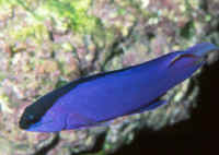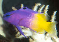 These fishes are easily overlooked in the wild, being small, secretive, and quick to "exit stage left". Being an avid diver and having frequented their environments for more than twenty five years I can assure you their numbers are many. A bright, small flashlight reveals them hiding up close, and at angles along cave walls and ledges. The two valuable species and their congener are found in the same sorts of steeply (seventy percent plus) inclined reef fronts, aka "walls". The Royal Gramma occupies the shallowest waters, very generally from the surface to 60-80 feet, being dislocated by the Black-Cap, Gramma melacara, which is in turn is displaced by the third Gramma species, the yellow-cheek Gramma linki, at 120-160 feet on down. You can understand, given the necessary hang-time (hours) to decompress and limited diver collecting minutes, why the deeper water species cost so much more. The 'other' Gramma genus Lipogramma is rarely seen in the trade as these fish are deep water denizens that, though attractive and equally peaceable as the genus Gramma, are not as strikingly colored. Lipogramma klayi is sometimes found as a 'contaminant', mixed in with Gramma loreto shipments as it is similar appearing. Selection: The single most important 'tip' on picking Grammas I can grant you is to be patient; wait a good week or two after your supplier receives theirs to purchase them. For tank-raised individuals, this brief period will allow acclimation to aquarium conditions and virtually eliminate incidental losses.