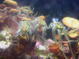 Green Brittle Star'¦Sick Or Reproducing? -- 04/1/08 I have had a green brittle star for 9 months in a 120 gallon tank. It has been healthy & grown well! <<Mmm'¦ Ophiarachna incrassata? Can indeed get large'¦and is known to ambush and eat fish>> Without any indication of being sick, in a matter of less than 24 hours, it rubbed itself against a rough piece of live rock & sawed itself into 4 pieces (all but one have a chunk of the body on it). <<You actually saw this? Strange'¦>> How can you tell if it did this because it is sick or reproducing? <<Don't know that you can'¦though this seems extreme for reproductive behavior>> What are the chances any of the pieces will survive? <<Not uncommon for those pieces with bits of the oral disc attached to grow in to/become whole animals again'¦in the wild. Not so much'¦in captivity>> All four are moving about the tank with ease. <<About all you can do is keep an eye on them'¦remove if they 'die' and begin to decompose>> Thanks for your advice. Kristie <<Happy to share. EricR>>