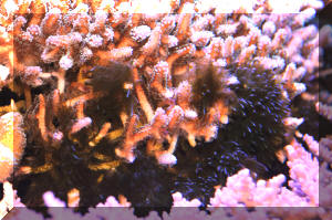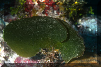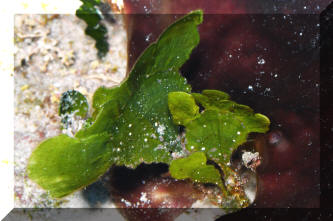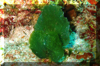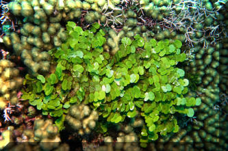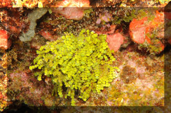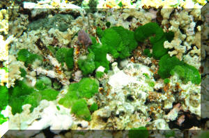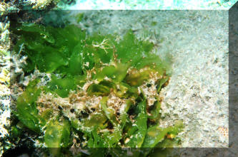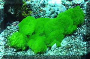 diving the world's aquatic environments. When most people picture entering the underwater world of tropical reefs, images of corals, rock, anemones and colorful fishes come to their minds. Is this realistic? Take a look around next time you're in the tropics, or at underwater pictures with an expansive view. Most of what's below the water is... water. Taking a look at the living things, doesn't something seem amiss? I mean, compared with the land, are there more animals than plants? On closer inspection you'll find there is plenty of photosynthesis going on, and necessarily so. The phytoplankton suspended below the surface and throughout the lighted water column, and endosymbiotic algae are everywhere, and active metabolically. Less obvious in most cases, but still important are the sessile, or attached micro-colonial and macro-algae. The strangeness of "why" there seem to be so relatively little "primary-producers" (photosynthetic plants, algae) compared with "consumers" (e.g. fishes and others) can be explained. First I'll make a boring and shocking statement: Things are different in aquatic versus terrestrial systems! Boring because of course you know lots of ways their different. Shocking in the realization of how dynamic life on the reefs is. It never fails to amuse me to read how "nutrient poor" tropical reefs are. Can you imagine the reasons for this? Obviously there is a tremendous amount of "fixed carbon" (i.e. living biomass) and flow of energy (everything eating and being eaten) going on; so why is the water considered "nutrient poor"? I'll tell you why; because those nutrients are jealously bound up by all the life around, and otherwise diluted by the oceans' volumes. They're not "nutrient poor", but nutrient "concentrated". Look again at a reef, up close. What do you see? The algae there grow very quickly, but none look intact, or really vigorous. How come? They're continuously grazed upon. In experiments where algal feeding is restricted by fencing the area and removing algal predators, the algae take over the surface in short order. What do you understand from the previous? Algae are a fast-growing, apparently important part of the natural reef. In a "balanced" setting their proliferation is kept in check by competition for scarce nutrient and perpetual grazing. Okay, me too. For Aquariums: This information can be of use to you in setting up and maintaining a marine system with more or less ease. Wouldn't it be great to strive for "a slice" of a real ocean environment in a captive system? Well, maybe not. Think about it; even if you had a humongous (let's say one thousand gallon) size tank, most of the space would be taken up by just the water, with actually very little rock, coral, and almost no macro-life at all. No, our captive seas are purposely over-crowded, hence over-fed/infused with nutrients, and therefore a struggle/challenge to keep balanced in our favor. Even in such cramped, small quarters would growing some algae help? Decidedly yes. They aid in bio-filtering, removing/concentrating nutrients, making the same unavailable for undesirable forms of life, act as food and shelter, and hey, they look good. Contrary to some reports macro-algae are not difficult to keep or culture. You don't need a tremendously sophisticated filtration system and a Doctorate in chemistry. Most of the live algae you can buy are Greens (Division Chlorophyta), though most of what is stated here applies to all macro-algae species. The next Section on Brown (Division Phaeophyta) algae lists some techniques for collecting and mail ordering algae should you have no local source. Live algae can be easily be brought into a system by simply placing a small piece of "live-rock". The following expands on the benefits of macro-algae and lists their captive living requirements. Benefits: 1) Bio-filtering: Macro-algae can aid considerably in establishing and stabilizing new or "out-of-whack" systems. They bring in and help to institute micro-organism communities, absorb nutrients introduced by food, decor and tap water. For systems with invertebrates, particularly anemones and live corals, live plant material can be especially helpful in improving water quality. In sufficient growing strength, macro-algae will remove nitrates, assist in buffering pH, uptake carbon dioxide producing oxygen, and assist in balancing trace elements (e.g. magnesium, phosphate, iron) To some extent they are useful as bio-indicators; real-time monitors of the viability of the system. If your macro-algae will not live and grow, or start dying back, it is a warning sign that something is out of kilter chemically, physically and/or biologically. 2) Algae Control: Having a batch of algae intentionally growing in the system will go a long way in limiting the growth of unwanted forms (slime, string algae, fungus and bacteria) by competing for light, space and nutrients. For you reef-keepers, be aware that over-zealous algal growth may affect coral health through nutrient competition, smothering and possibly metabolite poisoning. 3) Food: Many, if not most of the marine fishes and invertebrates we keep augment their diets with large algae. What better deal than to have some continuously available for casual munching? Similar to our own nutrition, many trace nutrients make their way through this cycle. 4) Habitat/Ornament: macro-algae serve to break up the physical environment, affording hiding space from tank bullies and aquarists, and piece of mind to the inhabitants. Beyond this, they are aesthetically attractive; sheer beauty in terms of color, shape, size and motion. Living Requirements: For you folks with previous experience this will be very familiar turf. If pressed, you could write a parallel for using live aquarium plants in freshwater; so, what it takes to keep and grow marine algae are: A) An established cycled, stable environment with "typical" conditions (high, steady pH; 1.021-1.025 specific gravity...) Synthetic w