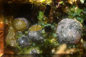 Green Bubble Weed. 8 in. diameter max. Rounded cells. See Valonia below. Shots in Belize and