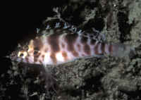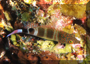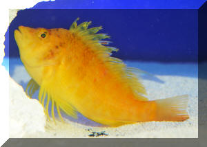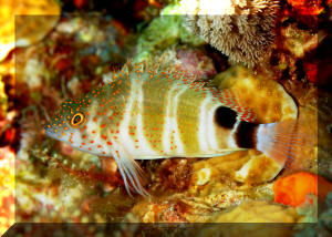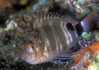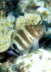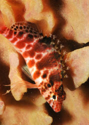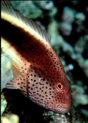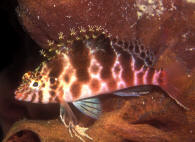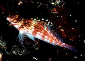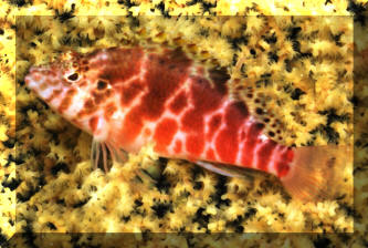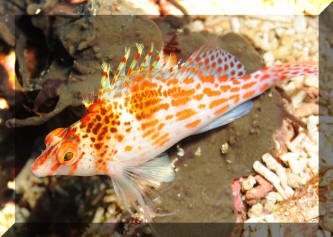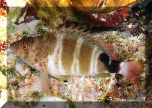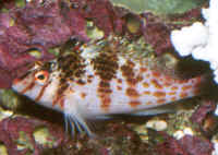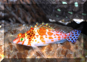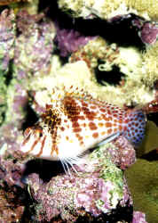 "Excuse me; I'm sorry, I think you have a dead fish." "Oh, really? Where? (Not that Hawkfish again!) "Well yes, look closely; you'll detect that beauty is still alive. It's just it's habit to hang out on a rock, coral or the bottom like that. To observe real "hawk-like" behavior, all one need do is watch for a while. When something of interest catches the Hawkfish's eye, it is quick to swoop up or down and investigate." Hawkfishes are peculiar fishes that fill a void that no other fish can or does. Their chubby bodies and unique coloring are a must for every type of marine system. They go from the reef tank to the community tank with a wide range of compatible tank-mates. Their seemingly continuous, sedentary "perching" is about the only negative thing that can be said about the Hawkfishes. These colorful, interesting fishes are undemanding in terms of water quality & foods; they get along well with other species and are generally fast-enough and tankmate-wise to avoid being hassled. But remember; their mouths are quite large, so watch out when adding shrimps and small fishes because your Hawkfish is watching out for them. Classification: Hawkfishes comprise twenty seven species in nine genera currently. Their distribution range is mainly Indo-Pacific with two species in the tropical West and East Atlantic. All are marine. Most species are found in shallow water with some to a few hundred feet. They bear a close resemblance to the Rockfishes/Scorpionfishes/Lionfishes (family Scorpaenidae) except in lacking their prominent head spines. Hawkfishes have a continuous hard and soft dorsal fin of ten spines, often with cirri (see above photo: they look like small pom-poms) at their tips. Ray counts are eleven to seventeen for the soft dorsal fin, five to seven soft rays for anal fins. They have 26 to 28 vertebrae. The pectoral fins are distinctive in having elongated, unbranched lower rays. The tail fin is squared off. Another important trait is that the cirrhitid family lacks swim bladders; allowing them to be rapidly decompressed after capture. Species/Notes of Interest to Aquarists: