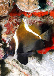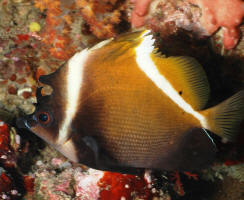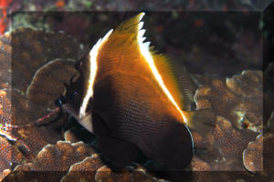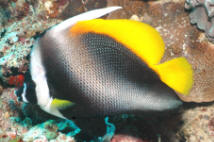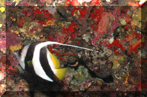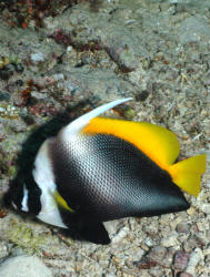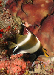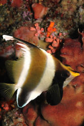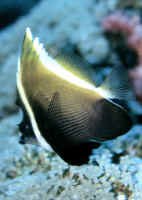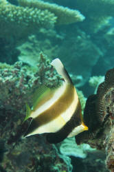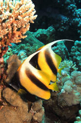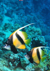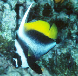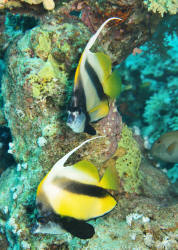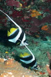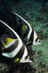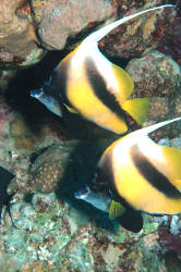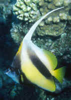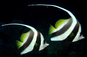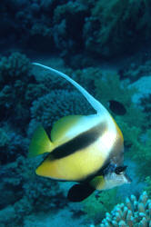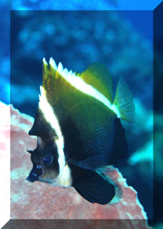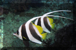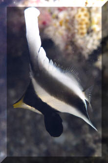 Saltwater Butterflyfishes are so hard to keep; they have narrow chemical and physical water quality tolerances, are finicky eaters & die for mysterious reasons....." This statement may be so for some species, especially for some of the coral-feeders, but certainly not for the Butterflyfishes in the genus Heniochus. They are superbly adaptable aquarium specimens which acclimate quickly, thrive under a variety of conditions, are not quarrelsome & readily accept all foods. Classification: The eight known species of the genus are members of the butterflyfish family Chaetodontidae, meaning "bristle teeth" in reference to their prising snout and dentition. All eight species are similarly shaped with laterally compressed sides, a pointed rostrum and a lengthened fourth dorsal ray. Their German common name is "Wimplefish" (like Wimple's piranha) meaning "Pennantfish" or "Bannerfish". A wimple is a type of hat with feathers of which the heightened dorsal is reminiscent. For various structural similarities Heniochus spp. are considered derived from and closely related to another butterfly genus Hemitaurichthys which in turn is from the mega-genus Chaetodon. Some brief notes on the various species: