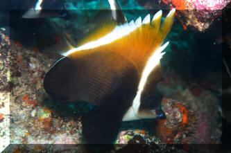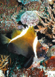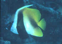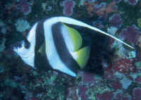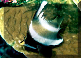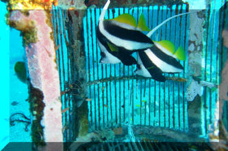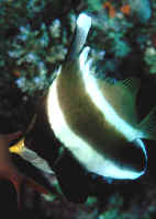 Selection Is best done from one dealer's tank, buying all the desired individuals of the genus and introducing them all at once. Though most Heniochus are not quarrelsome per species or individual, they can become territorial in small systems. Fifteen to twenty gallons of space per copy is a suggested minimum. Many species can attain a length of ten inches. Buy smaller specimens (three to four inch in total length) if possible as these adapt best. Be wary of slightly smaller ones; particularly if they are thin of musculature between the eyes in the head region. These may eat, but not recover to full health. Environmental: The several species of Heniochus live in shallow water near the sea bed; typically near broken shorelines. Their slim bodies make them well-disposed to quick passage and safety between the rocks and corals of their wild environs. They have a wide tolerance of salinities as Butterflyfishes go, but appreciate one that are not too consistently low. 1.025-1.021 is a tolerable range. Higher pH's, 8.2-8.4 are recommended. Chemical parameters are likewise not a problem with these species. They are more tolerant of endogenous pollution than most commonly kept aquarium species. Your charges will be healthier and live better, longer if you maintain better water quality. Use of a skimmer and the presence/culture of algae, like Caulerpa goes a long way in ensuring suitable water. Behavior: These Butterflyfishes are social animals, being found in groups of a pair or more to veritable shoals of a few hundred individuals. It makes sense that they should not be kept solitarily if possible. Try to observe them in your dealer's tank and choose two or more that appear to associate readily. If room and/or finances restrict your selection, H. acuminatus seems to adjust best at being "the only Heni in the tank". Heniochus as Butterflyfishes in general, are not aggressive; they have neither the teeth or the body armament for it. If enough habitat is provided, they will gladly choose flight over fighting. Heniochus, between and among species, may "butt" with their head projections, but this is generally not dangerous. Another bonus: some species have been observed to be facultative cleaners; especially as young. This is yet another example of a "can-do" parasite remover, other than more obligate cleaner wrasses or gobies. Reproduction: Actual spawning behavior has not been observed in the wild or captivity for Heniochus or any Chaetodontid to date (Burgess, 1978). It is postulated that 3000-4000 eggs are released in a spawning and scattered by currents in the upper water column, i.e. they are pelagic. Predation: Heniochus may be eaten by typical large predatory fishes in whose mouths they can fit. Be wary of basses, Lionfishes, morays et al.. Though they are "quick on their fins " during the day, Butterflyfishes "sleep" peacefully on the bottom in the evenings and may become midnight snacks. Feeding: Heniochus are largely plankton eaters in the wild. They readily consume frozen, flake, fresh, freeze-dried, seemingly whatever foods offered- even directly from the surface by hand. These Butterflyfishes should be fed a variety of foods as per the rest of their family; frequently, in small amounts, at least two, three times daily. Clean, pollution-free Tubificid worms are relished, after the fish have been trained on them. Use live freshwater foods as an occasional high-protein treat. Some vegetable matter should be offered in the diet; best if grown in the system itself. Vitamin supplements are useful applied to the food or water directly; fructose sugar may even be applied to bolster an ailing specimen (Baensch in Allen & Steene, 1979) as marine fishes "drink" environmental water. Diseases: This genus is relatively disease free. They are susceptible, as are most tropical marine fishes, to the two most common coral reef parasitic "plagues": Amyloodinium and Cryptocaryon; displaying their typical symptomology (rapid breathing, listlessness, clamped fins). Most reports show Bannerfishes to be easily treated with manipulation of temperature and specific gravity, and no great sensitivity to common therapeutics, like copper compounds. Various external parasites may be present and become problematical in recently captured wild specimens, if over-stressed. Gill flukes and parasitic copepod crustaceans may be reduced/alleviated through quarantine, dips or other chemical treatment. More appropriately, they might be biologically controlled through the use of a "cleaner" relationship. One condition that Bannerfishes are prone to is "lateral-line disease". Regardless of where you stand on the debates of "original" cause(s) (Vibrio, other bacteria, water quality, diet, genetics, combo, ...) this disease can lead to death within a few days. What to do? Standard Operating Procedure: Pick out healthy stock; ascertain that they've been at your dealer's at least a few days... or put down a deposit and leave them. Ask to see them eat what you're going to feed. Run them through a disinfecting freshwater dip. Acclimate to a viable system. Keep your organic load low..... & if your fish should begin "breaking down" I suggest a regimen of medicated food, such as Tetra (tm) or Sera's (tm) line of antibiotic-fortified prepared flake foods. Gram-negative antibiotics and Furacyn compounds have been found to be effective. Summary What about the specialized Tholichthys larvae of these species with their bizarre spines? Chaetodontids and Scatophagids (scats) are the only families with this trait. Will you be the first to spawn and rear or even just observe and photograph spawning in the wild? By any and all means try this genus. Heniochus look delicate- they are not. They are indeed butterflies of the sea, who are hardy, undemanding and well-suited for aquaria. Bibliography/Further Reading Allen, Gerald R. and Roger C. Steene, 1978,79. Butterfly and Angelfishes of the World. Mergus, W. Germany Burgess, Warren E., 1978 Butterfl