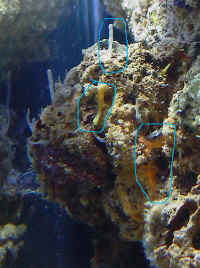 Mystery Hitchhiker on LR (12/23/2003) I'm relatively new to the art of Salt Water aquaria and am continually fascinated by the variety of life you find a few chunks of live rock. <me too> I've been able to identify most but I can't find this guy anywhere. Is it a sponge? A coral? A Martian? Can you help? <This does appear to be some type of encrusting sponge. Hard to say which one specifically, but likely harmless, though some sponges are toxic. You might want to post the picture on WetWebFotos and solicit an ID there.> Thanks for the months of help you've already given me. Troy <On behalf of the crew members who have previously helped you, you are certainly welcome. Steve Allen.> Polyp ID (12/22/2003) I was wondering if you could help me identify a polyp that I used to have in my aquarium. It's brown with a stalk. It looks kind of like one of those Dr. Seuss trees or something. Kind of like a fuzzy Pom Pom glued to a straight stick. They were small, the "pom poms" being about the same diameter as some airline tubing. They were also colonial, spreading in a carpet like fashion. If I had to guess, I'd say they were about ? to ? of an inch tall. They swayed with the currents. I lost them in a move and was trying to get a name so I could get some more. I looked through pictures on the WWM site for about an hour, and couldn't find them, I guess because they aren't very dramatic. <Really not possible to ID without a picture. Take a look at Clavularia and xenia.> Oh, and by the way, the Wet Web Photo site is not working all that well in case you guys didn't know. <having some problems since changing hosts. Zo is working on it.> If you could point me to some pictures and possible names I would greatly appreciate it. Thanks, John Jordan <Hope this helps, Steve Allen> Mystery Critter Follow-up (12/22/2003) Hi, to answer your questions, the size of my tank is 5 ft (L) x 45cm (W) x 2 ft (H) it has been set up for a bit over 6 months, yes, it has live rock about 4kgs and 6 green Chromis. I got the live rock from VEBAS aquariums in Fremantle Western Australia. I believe they get the rock from coral bay and have a license, I have got some wet sand from the beach (they could have come in that) they look like little prawns ???? thank you u for your reply could you please help, please reply ASAP <As before, I strongly doubt that these are mantis shrimp, but Ian is right, a picture would be helpful. Neither of us can make an ID without seeing a picture. Do check WWM or other sources for pictures of Mantis Shrimp and copepods to see if either match. The largest copepods get to nearly a centimeter in length. I have these in my tank. Mantis Shrimp will get to several inches in length. If you or a friend have a digital camera, do send a picture so we can try to give you a better ID.> thank you, from Ryan <You're welcome, Steve Allen> What the heck are they? Hey guys, bought the latest book and it is phenomenal, best one I have seen in a while and really helpful. <thanks kindly... its very redeeming to hear.> My reason for writing are the things that have popped up in my little reef tank. I know I am not the first one to have these but cannot tell what they are. The little creatures look like little white jellyfish and are n o bigger than 1/4" in diameter. The swim around and look just like miniature jellies. I have searched but couldn't come up with an answer. Please help and lemme know if I want them. Thanks Sean <without a clear picture, I cannot say for certain. But you may indeed have Cassiopeia jellyfish larvae (common from importing small hermits and snails). Else, if you have mature coral in the tank, you have some other cnidarian larvae. Anthony> Parasites floating in the tank... nope 12/16/03 hi have 175 gal salt water tank .have developed parasites they look like tiny white worms and I mean tiny you can see them on the fish and also in the tank by the millions. tried treating it but no luck. also the fish have developed HITH can you help please. thank you <I cannot say for certain if your fish have parasites, but I can assure you that no fish parasites that you are likely to ever encounter can be seen with the naked eye in the aquarium water or on the aquarium walls, gravel, etc. No such thing fortunately. :) The worms at worst are a sign of overfeeding... but may instead simply be beneficial microorganisms from live rock or live sand. Please review our section on wetwebmedia.com regarding fish diseases (many articles and FAQs to read and learn from). Anthony> Critters in my refugium Can you help me identify some critters in my refugium? They swim, are 0.25 to 0.5 cm in length, are mostly translucent, have a fish like tail and antennae on the end I would identify as the head. They swim along the bottom as well as the top of the refugium. I can't imagine these being fish or shrimp. The refugium is loaded with macro algae, live rock rubble and amphipod/copepod type critters. <Hi Brian. It sounds like you have a thriving refugium! If you have ruled these critters out as amphipods or copepods, I would guess mysids next. Mysids tend to stay near substrate, swim around quickly and erratically, and look like tiny shrimp. It is also possible that they are the larvae of another critter that has spawned in your tank (clown fish, decorative shrimp, crabs). It is hard to guess without a picture. I would lean toward the larvae idea if they are only occasionally present.> Is there a upside/downside to having these guys in my refugium? <It is likely almost all upside and little or no downside. Very few critters that meet this description are pests, and those that are would have done significant damage if they are present in large numbers. Hope this helps. Adam>